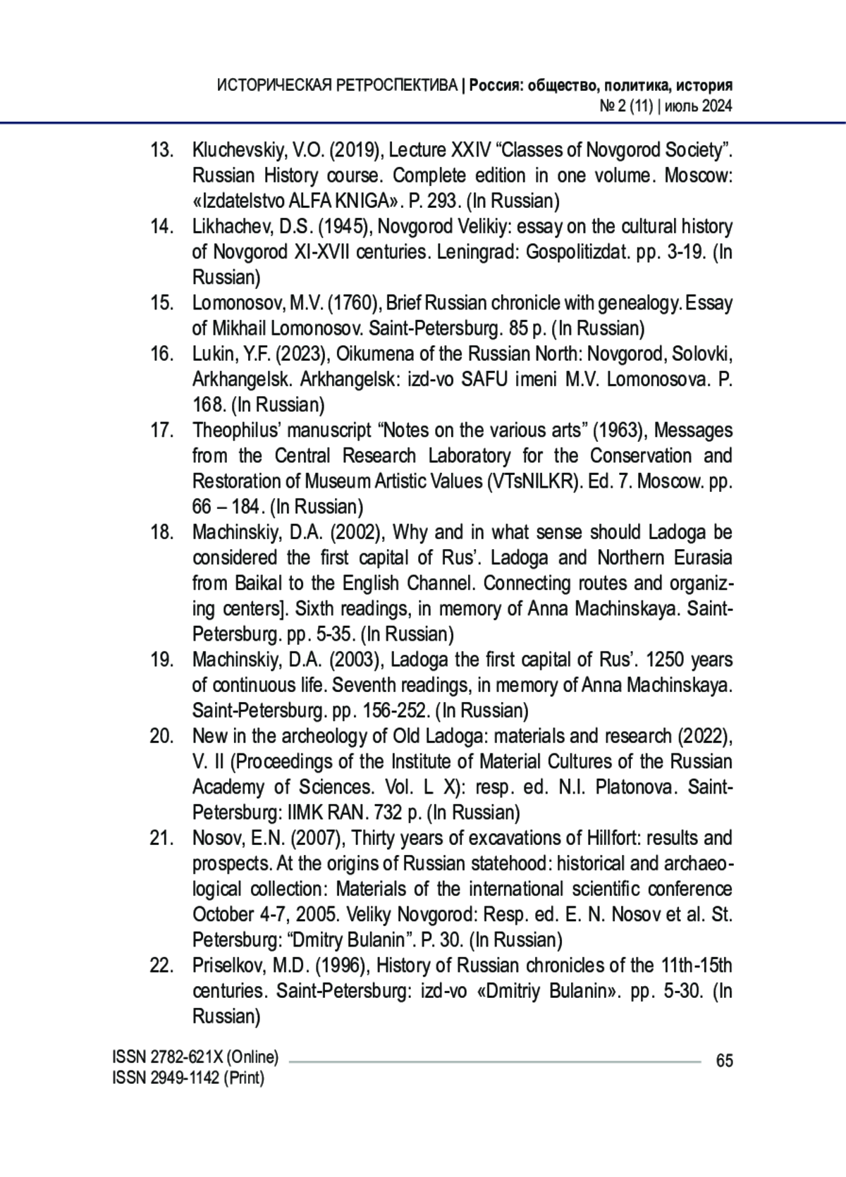 12. Кирпичников А.Н. (2013), Первая столица Руси старая Ладога [The first capital of Rus’ Old Ladoga]. Наше наследие. № 106. 13. Ключевский В.О. (2019), Лекция XXIV «Классы новгородского общества» [Lecture XXIV “Classes of Novgorod Society”]. Курс русской истории. Полное издание в одном томе. М.: «Издательство АЛЬФА-КНИГА». С. 293.