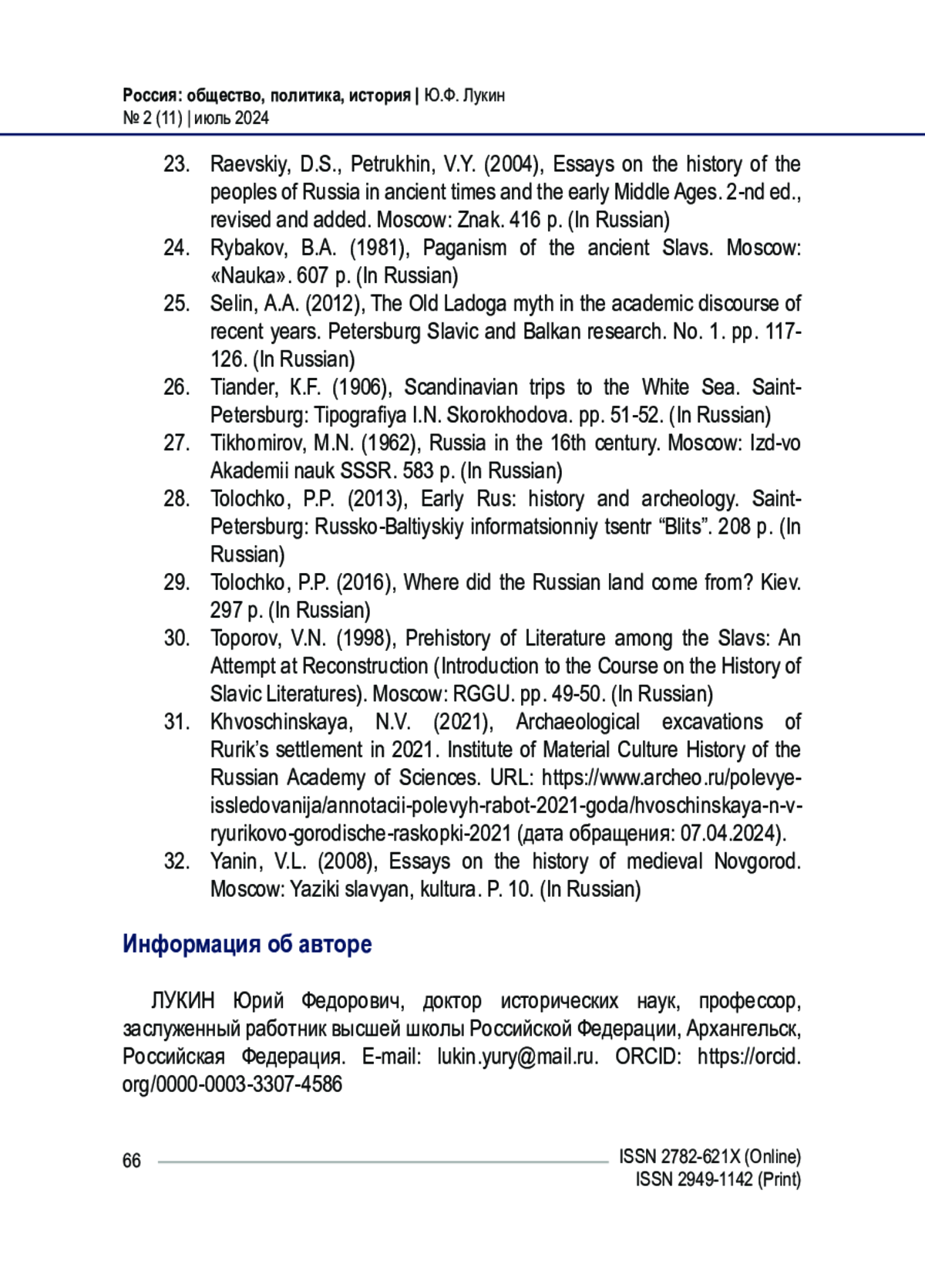 24. Селин А.А. (2012), Староладожский миф в академическом дискурсе последних лет [The Old Ladoga myth in the academic discourse of recent years]. Петербургские славянские и балканские исследования. №1. С. 117-126.