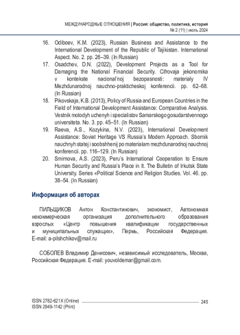 19. Раева А.С., Козыкина Н.В. (2023), Содействие международному развитию: советское наследие VS современный подход России [International Development Assistance: Soviet Heritage VS Russia’s Modern Approach]. Сборник научных статей и сообщений по материалам международной научной конференции. С. 116-129.