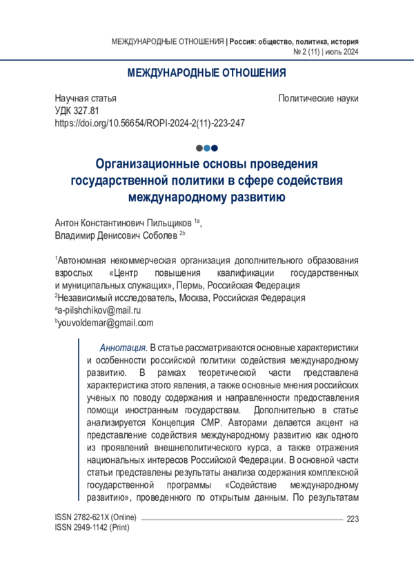В статье рассматриваются основные характеристики и особенности российской политики содействия международному развитию. В рамках теоретической части представлена характеристика этого явления, а также основные мнения российских ученых по поводу содержания и направленности предоставления помощи иностранным государствам. Дополнительно в статье анализируется Концепция СМР. Авторами делается акцент на представление содействия международному развитию как одного из проявлений внешнеполитического курса, а также отражения национальных интересов Российской Федерации. В основной части статьи представлены результаты анализа содержания комплексной государственной программы «Содействие международному развитию», проведенного по открытым данным. По результатам указанного анализа, авторами делается вывод о недостаточности представленных данных для формирования полной картины сущности, состава и содержания содействия международному развитию. При этом отмечается возможность выделения основных направлений оказания международной помощи и проблемных моментов.