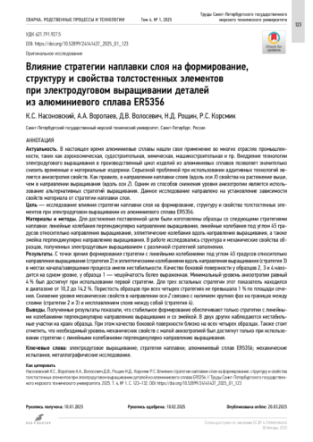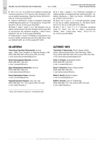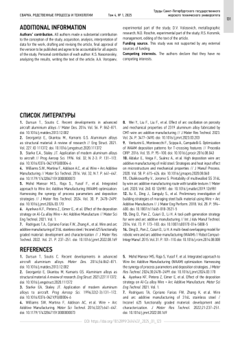 6. Ayarkwa K.F., Pintera Z., Eimer E., et al. Effect of the deposition strategy on Al-Cu alloy Wire + Arc Additive Manufacture // Mater Sci Eng Technol. 2021. Vol. 1.
