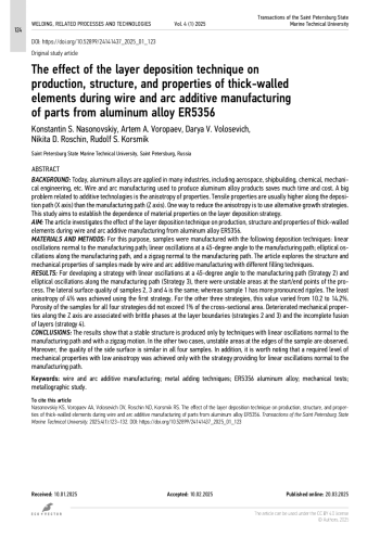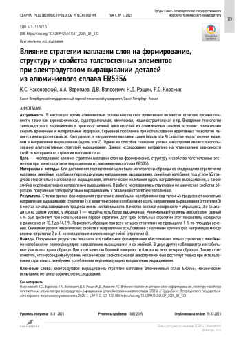 Цель — исследование влияния стратегии наплавки слоя на формирование, структуру и свойства толстостенных элементов при электродуговом выращивании из алюминиевого сплава ER5356.