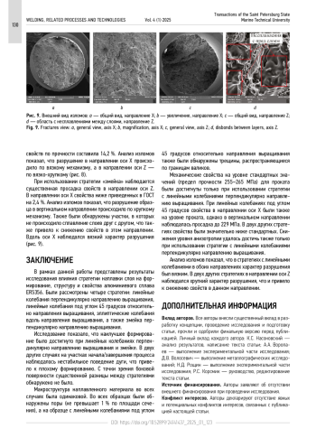 Результаты. С точки зрения формирования стратегии с линейными колебаниями под углом 45 градусов относительно направления выращивания (стратегия 2) и эллиптическими колебаниями вдоль направления выращивания (стратегия 3) в местах начала/завершения процесса имели нестабильности. Качество боковой поверхности у образцов 2, 3 и 4 находится на одном уровне, у образца 1 — чешуйчатость более выраженная. Минимальный уровень анизотропии равный 4 % был достигнут при использовании первой стратегии. Для трех остальных стратегии этот показатель находился в диапазоне от 10,2 до 14,2 %. Пористость образцов при всех четырех стратегиях не превышала 1 % по площади сечения. Снижение уровня механических свойств в направлении оси Z связано с наличием хрупких фаз на границах между слоями (стратегии 2 и 3) и несплавлением слоев между собой (стратегия 4).