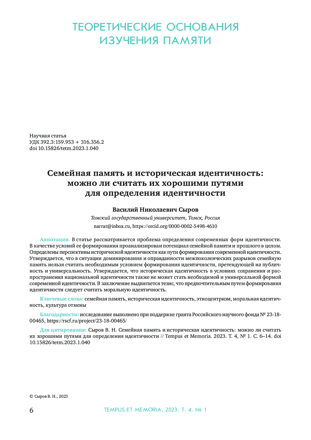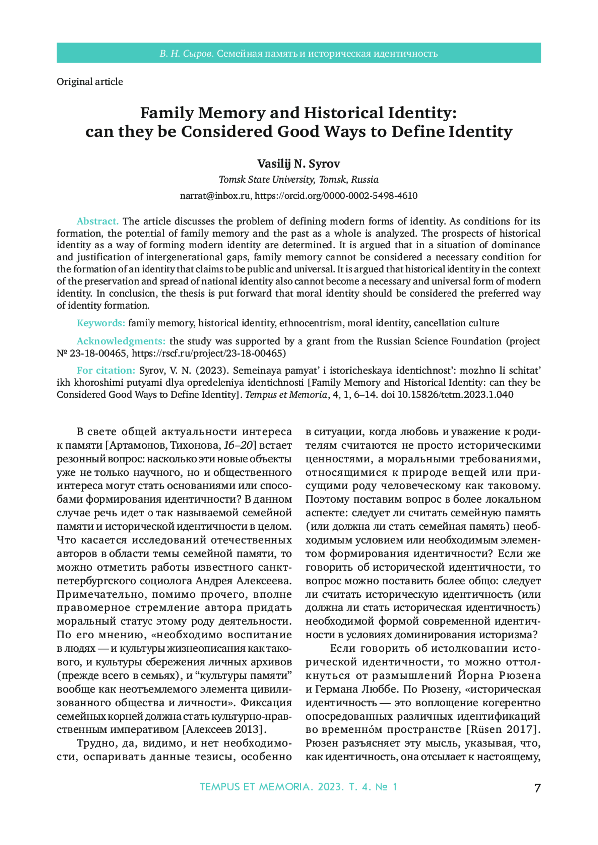 В свете общей актуальности интереса к памяти [Артамонов, Тихонова, 16–20] встает резонный вопрос: насколько эти новые объекты уже не только научного, но и общественного интереса могут стать основаниями или способами формирования идентичности? В данном случае речь идет о так называемой семейной памяти и исторической идентичности в целом. Что касается исследований отечественных авторов в области темы семейной памяти, то можно отметить работы известного санктпетербургского социолога Андрея Алексеева. Примечательно, помимо прочего, вполне правомерное стремление автора придать моральный статус этому роду деятельности. По его мнению, «необходимо воспитание в людях — и культуры жизнеописания как такового, и культуры сбережения личных архивов (прежде всего в семьях), и “культуры памяти” вообще как неотъемлемого элемента цивилизованного общества и личности». Фиксация семейных корней должна стать культурно-нравственным императивом [Алексеев 2013].