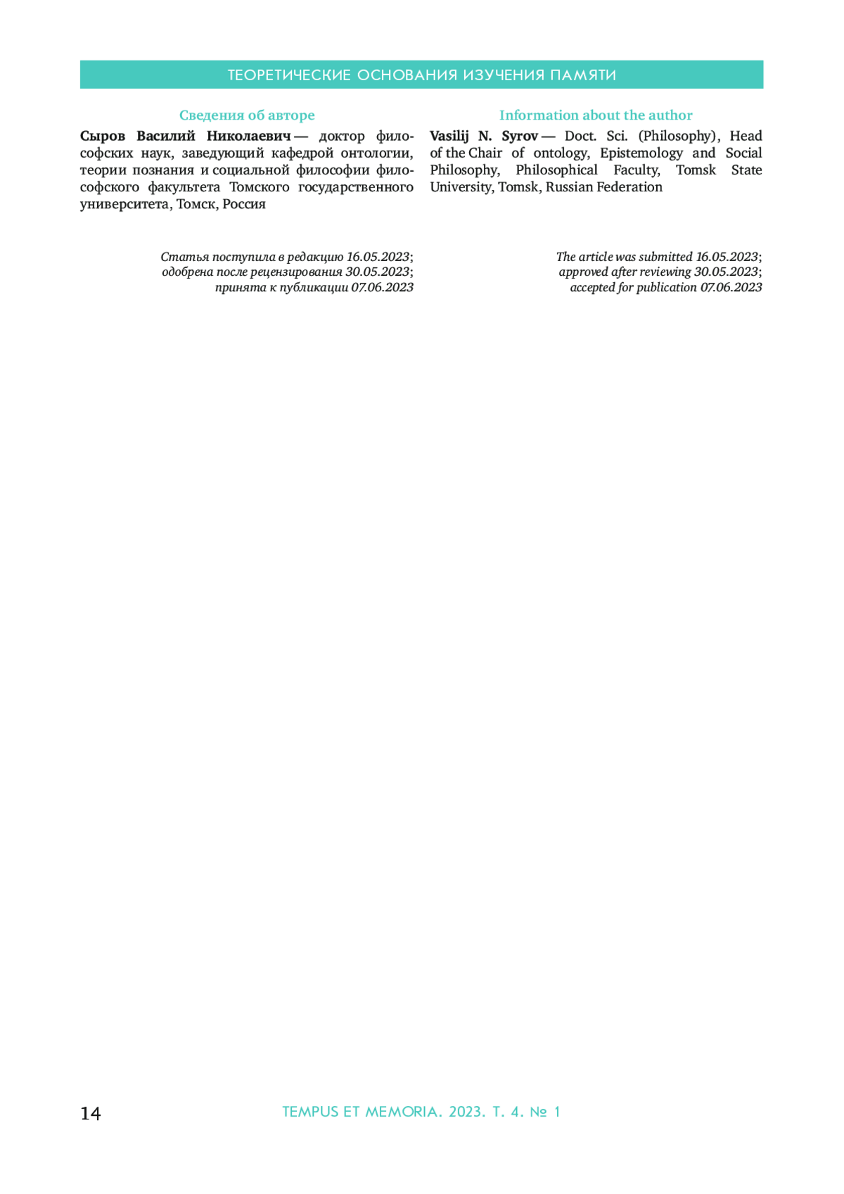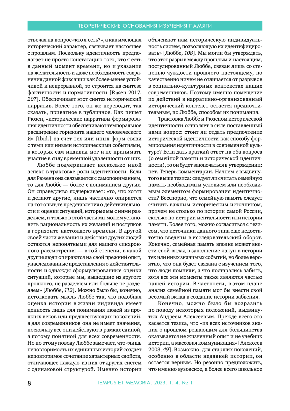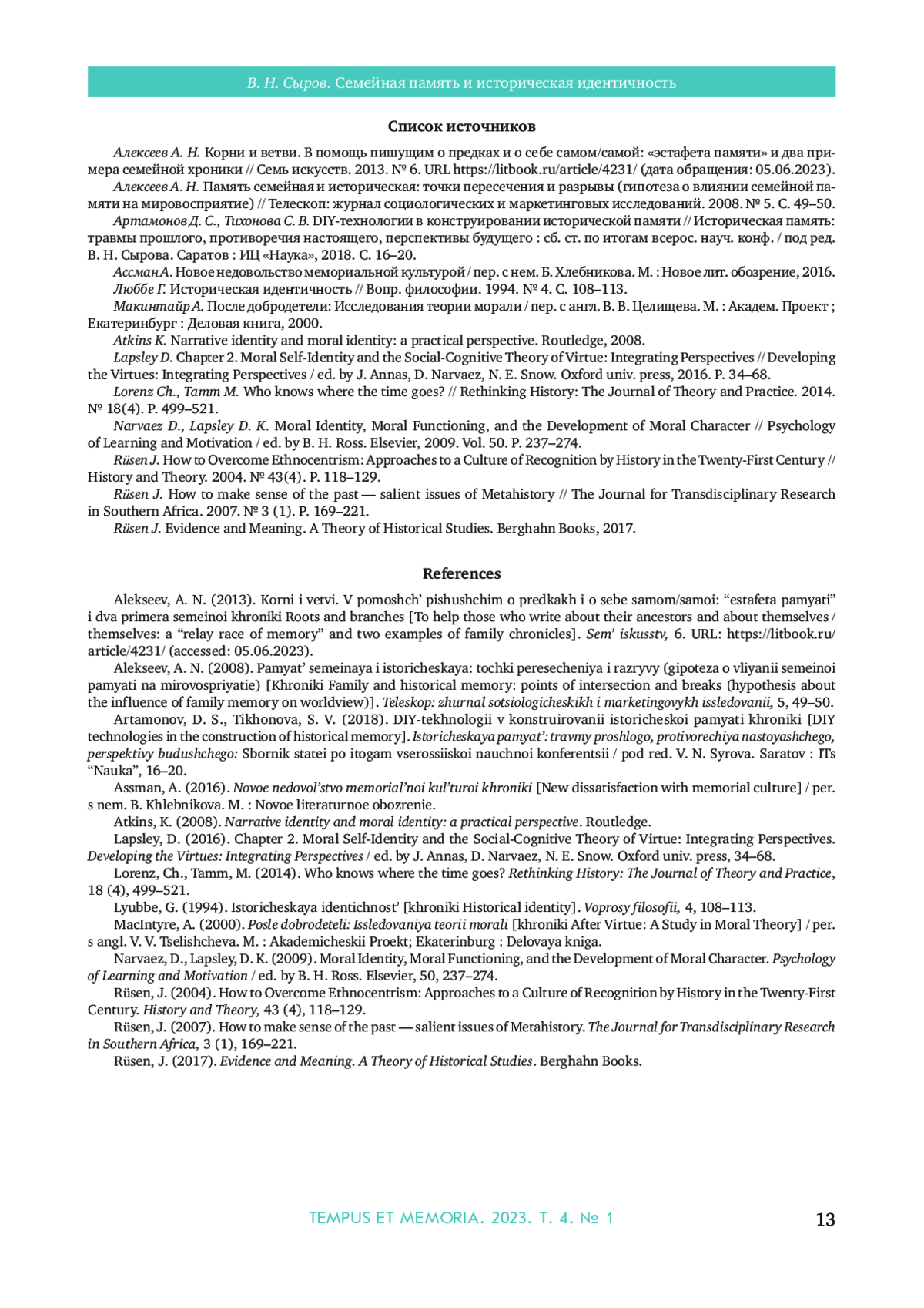 2. Алексеев А. Н. Память семейная и историческая: точки пересечения и разрывы (гипотеза о влиянии семейной памяти на мировосприятие) // Телескоп: журнал социологических и маркетинговых исследований. 2008. № 5. С. 49-50. EDN: KYWVGV