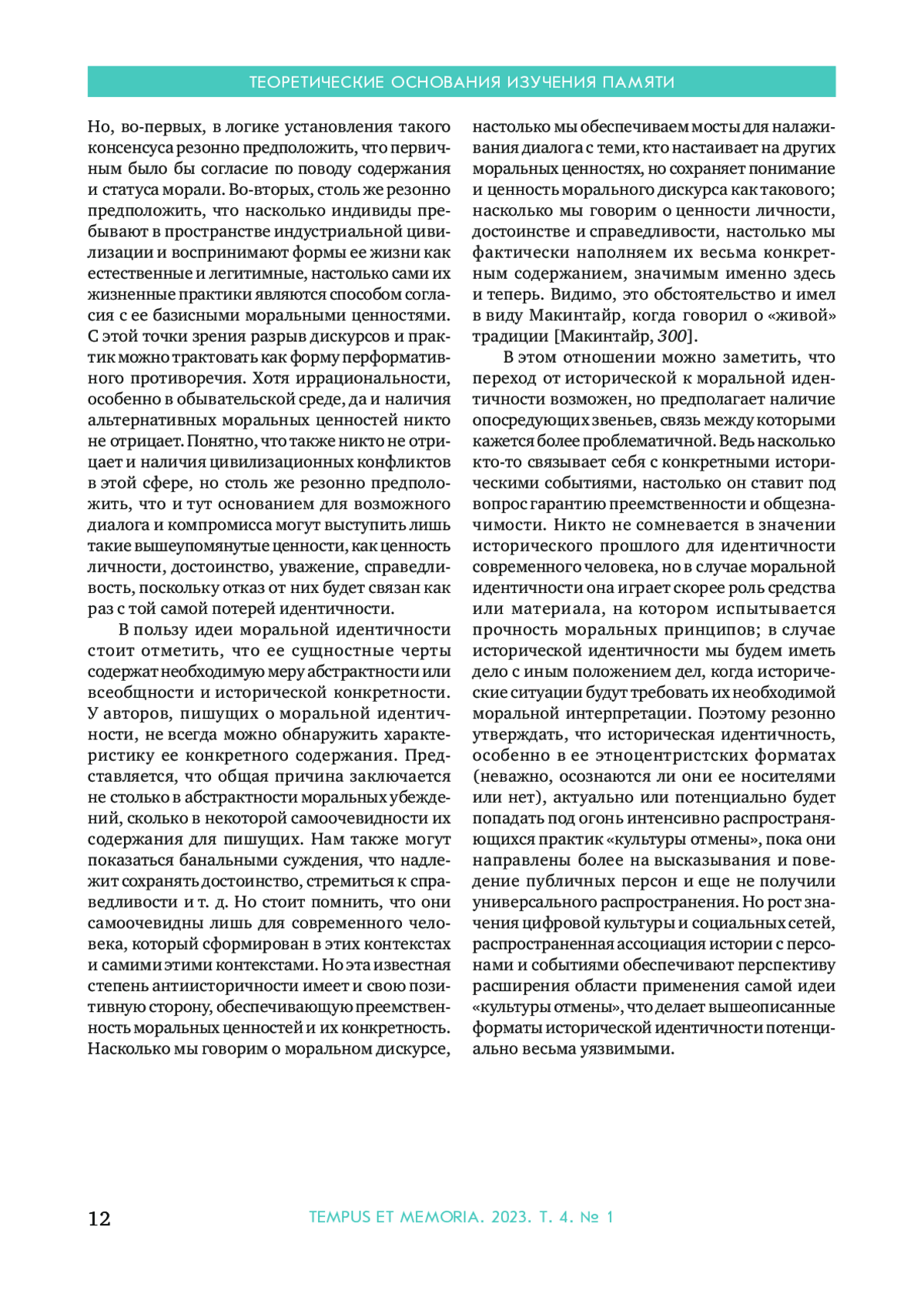 В статье рассматривается проблема определения современных форм идентичности. В качестве условий ее формирования проанализирован потенциал семейной памяти и прошлого в целом. Определены перспективы исторической идентичности как пути формирования современной идентичности. Утверждается, что в ситуации доминирования и оправданности межпоколенческих разрывов семейную память нельзя считать необходимым условием формирования идентичности, претендующей на публичность и универсальность. Утверждается, что историческая идентичность в условиях сохранения и распространения национальной идентичности также не может стать необходимой и универсальной формой современной идентичности. В заключение выдвигается тезис, что предпочтительным путем формирования идентичности следует считать моральную идентичность.