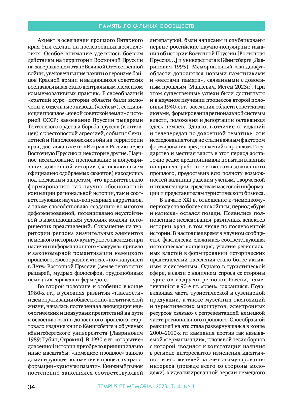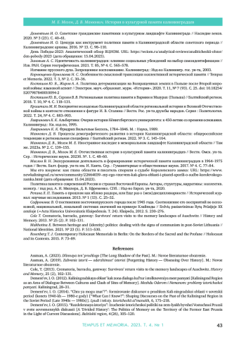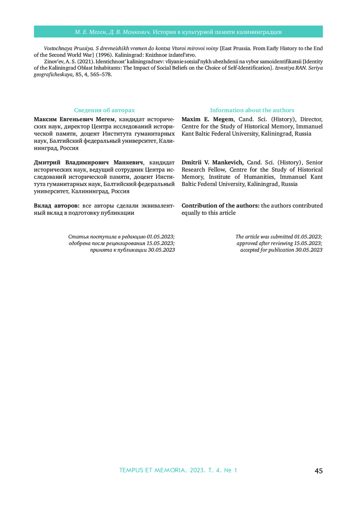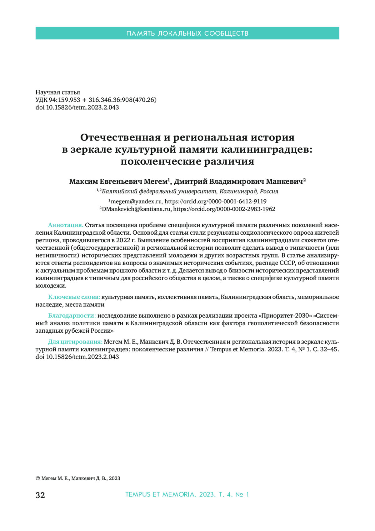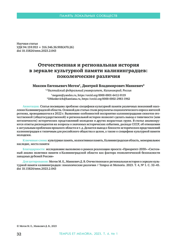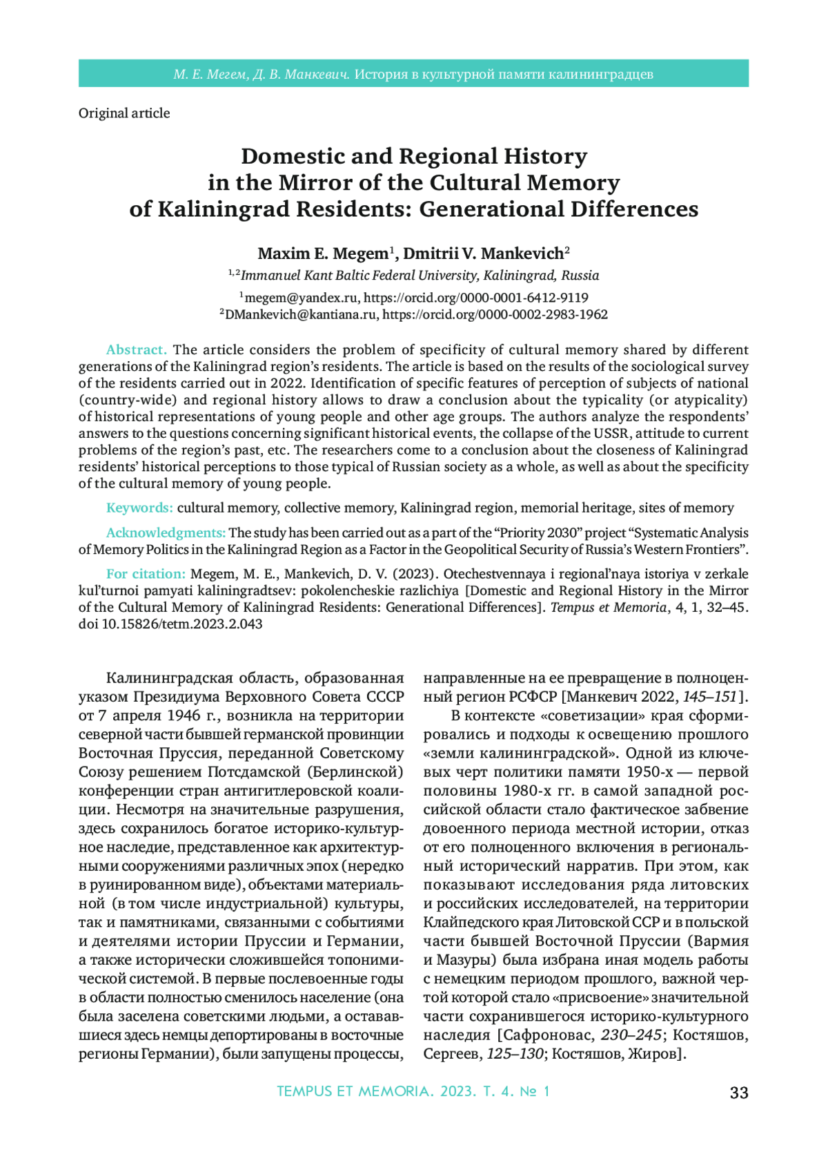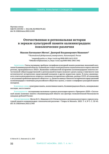 25. Манкевич Д. В., Мегем М. Е. Отечественная история в культурной памяти калининградцев // Вестник Омского университета. Сер.: Исторические науки. 2023б. №. 1. С. 48-60. EDN: QEWTPS