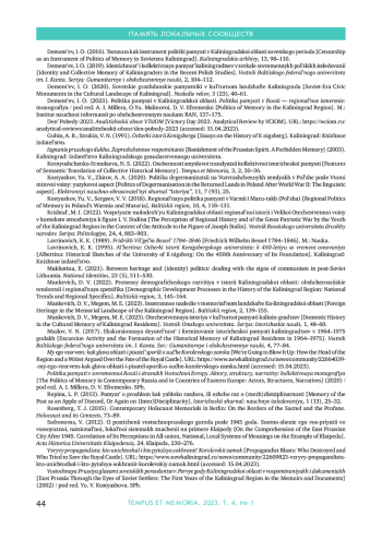 11. Дементьев И. О. Политика памяти в Калининградской области // Политика памяти в России - региональное измерение: моногр. / под ред. А. И. Миллера, О. Ю. Малиновой, Д. В. Ефременко. М.: Ин-т науч. информации по обществ. наукам РАН, 2023. С. 137-175. EDN: ZRFSMN