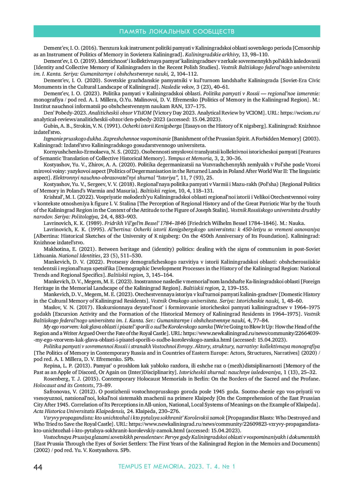 1. Ассман А. Длинная тень прошлого. М.: Новое лит. обозрение, 2023. ▼ Контекст 2. Ассман А. Забвение истории - одержимость историей. М.: Новое лит. обозрение, 2019. ▼ Контекст 3. Взрывы пропагандиста: кто уничтожал и кто пытался сохранить Королевский замок. URL: https://www. newkaliningrad. ru/news/community/22609823-vzryvy-propagandista-kto-unichtozhal-i-kto-pytalsya-sokhranit-korolevskiyzamok. html (дата обращения: 15.04.2023). 4. Восточная Пруссия глазами советских переселенцев: Первые годы Калининградской области в воспоминаниях и документах / под ред. Ю. В. Костяшова. СПб., 2002. EDN: UQUGWD 5. Восточная Пруссия. С древнейших времен до конца Второй мировой войны. Калининград: Кн. изд-во, 1996. 6. Губин А. Б., Строкин В. Н. Очерки истории Кёнигсберга. Калининград: Кн. изд-во, 1991. 7. Дементьев И. О. “Разделенная история”: Изучение исторической политики на землях бывшей Восточной Пруссии в свете современных дискуссий // Балтийский регион. 2015. № 4 (26). С. 105-120. EDN: VCYWVT ▼ Контекст 8. Дементьев И. О. “Что я могу знать?”: формирование дискурсов о прошлом Калининградской области в советский период (конец 1940-1980-е годы) // Люди и тексты: ист. альм. 2014. № 6. С. 175-218. EDN: VBCGQN ▼ Контекст 9. Дементьев И. О. Идентичность и коллективная память калининградцев в зеркале современных польских исследований // Вестник Балтийского федерального университета им. И. Канта. Сер.: Гуманитарные и общественные науки. 2019. № 2. С. 104-112. EDN: TUWZOM ▼ Контекст 10. Дементьев И. О. Калининградская область как зона диалога культур и столкновения мест памяти // Между Одером и Неманом: проблемы исторической памяти. Калининград, 2012. С. 28-31. EDN: XBYUUB ▼ Контекст 11. Дементьев И. О. Политика памяти в Калининградской области // Политика памяти в России - региональное измерение: моногр. / под ред. А. И. Миллера, О. Ю. Малиновой, Д. В. Ефременко. М.: Ин-т науч. информации по обществ. наукам РАН, 2023. С. 137-175. EDN: ZRFSMN ▼ Контекст 12. Дементьев И. О. Советские гражданские памятники в культурном ландшафте Калининграда // Наследие веков. 2020. № 3 (23). С. 40-61. EDN: CYAAAZ ▼ Контекст 13. Дементьев И. О. Цензура как инструмент политики памяти в Калининградской области советского периода // Калининградские архивы. 2016. № 13. С. 98-110. EDN: YKKTLP 14. День Победы-2023: Аналитический обзор ВЦИОМ. URL: https://wciom. ru/analytical-reviews/analiticheskii-obzor/den-pobedy-2023 (дата обращения: 15.04.2023). ▼ Контекст 15. Зиновьев А. С. Идентичность калининградцев: влияние социальных убеждений на выбор самоидентификации // Известия РАН. Серия географическая. 2021. Т. 85, № 4. С. 565-578. EDN: NBFFCV 16. Изгнание прусского духа. Запрещенное воспоминание. Калининград: Изд-во Калинингр. гос. ун-та, 2003. 17. Корнющенко-Ермолаева Н. С. Особенности смысловой трансляции коллективной исторической памяти // Tempus et Memoria. 2022. Т. 3, № 2. С. 30-36. EDN: CLFEUA 18. Костяшов Ю. В., Жиров А. А. Политика дегерманизации на Возвращенных землях в Польше после Второй мировой войны: языковой аспект // Электрон. науч.-образоват. журн. “История”. 2020. Т. 11, № 7 (93). С. 25. DOI: 10.18254/S207987840010094-2 EDN: QOCVLZ 19. Костяшов Ю. В., Сергеев В. В. Региональная политика памяти в Вармии и Мазурах (Польша) // Балтийский регион. 2018. Т. 10, № 4. С. 118-131. EDN: YVKKCD 20. Кришталь М. И. Восприятие молодежью Калининградской области региональной истории и Великой Отечественной войны в контексте отношения к фигуре И. В. Сталина // Вестник Российского университета дружбы народов. Серия: Политология. 2022. Т. 24, № 4. С. 883-903. EDN: WDEPEJ 21. Лавринович К. К. Альбертина: Очерки истории Кёнигсбергского университета: к 450-летию со времени основа