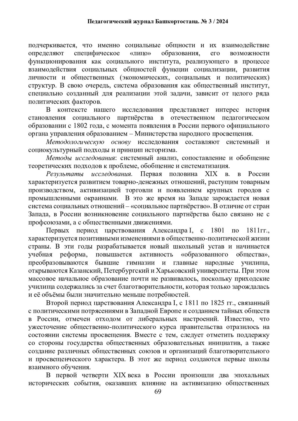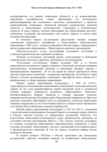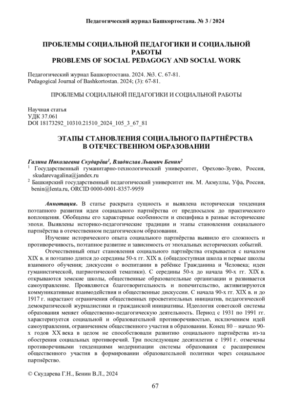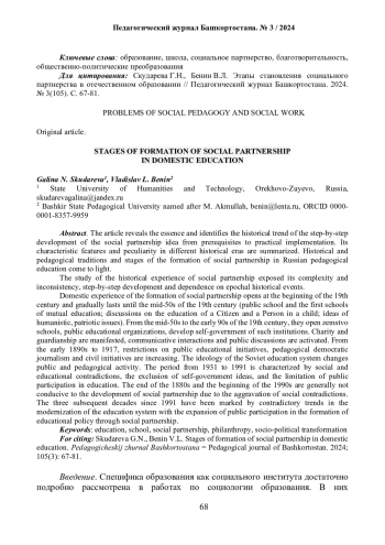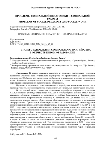 Отечественный опыт становления социального партнёрства открывается с началом XIX в. и поэтапно длится до середины 50-х гг. XIX в. (общедоступная школа и первые школы взаимного обучения; дискуссии о воспитании в ребёнке Гражданина и Человека; идеи гуманистической, патриотической тематики). С середины 50-х до начала 90-х гг. XIX в. открываются земские школы, общественные образовательные организации и развивается самоуправление. Проявляются благотворительность и попечительство, активизируются коммуникативные взаимодействия и общественные дискуссии. С начала 90-х гг. XIX в. и до 1917 г. нарастают ограничения общественных просветительных инициатив, педагогической демократической журналистики и гражданской инициативы. Идеология советской системы образования меняет общественно-педагогическую деятельность. Период с 1931 по 1991 гг. характеризуется социальной и образовательной противоречивостью, исключением идей самоуправления, ограничением общественного участия в образовании. Конец 80 ‒ начало 90- х годов ХХ века в целом не способствовали развитию социального партнёрства из-за обострения социальных противоречий. Три последующие десятилетия с 1991 г. отмечены противоречивыми тенденциями модернизации системы образования с расширением общественного участия в формировании образовательной политики через социальное партнёрство.