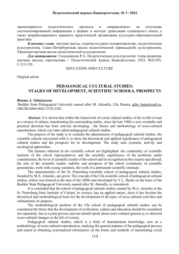 Рассмотрена концепция Уфимской научной школы педагогической культурологии В. Л. Бенина, сложившейся на рубеже 2000-х гг. и получившей развитие на базе Башкирского государственного педагогический университет им. М. Акмуллы.