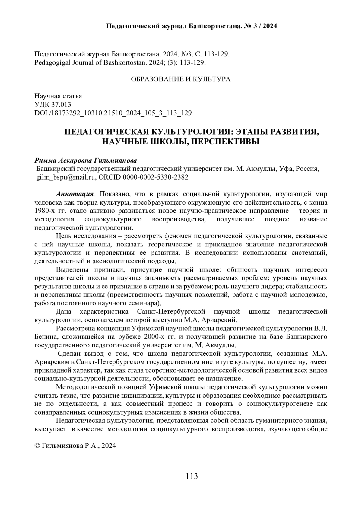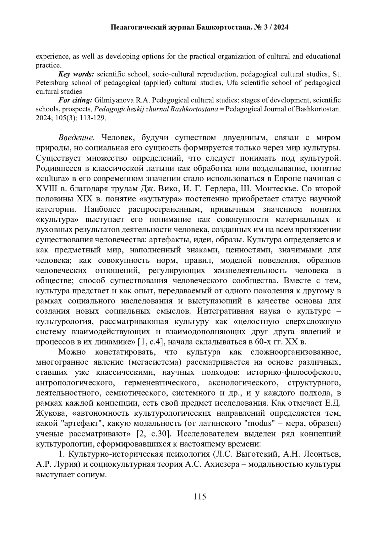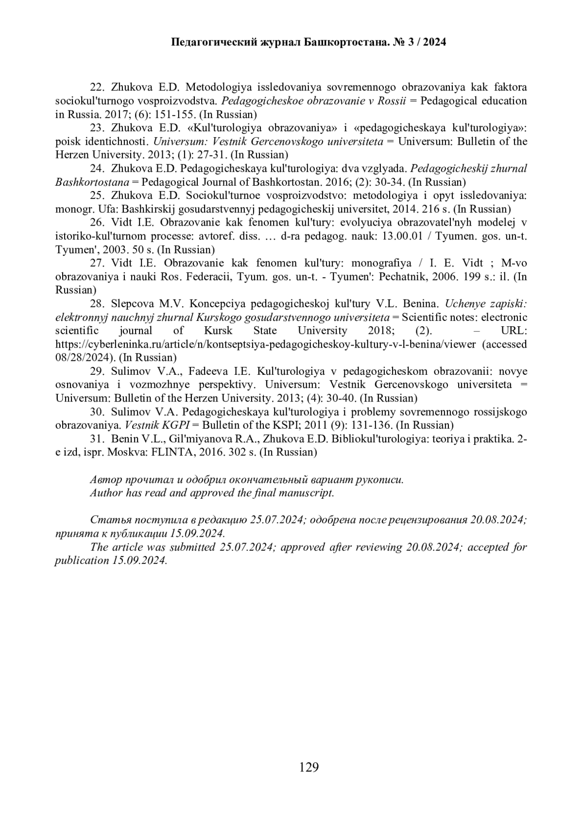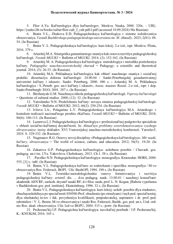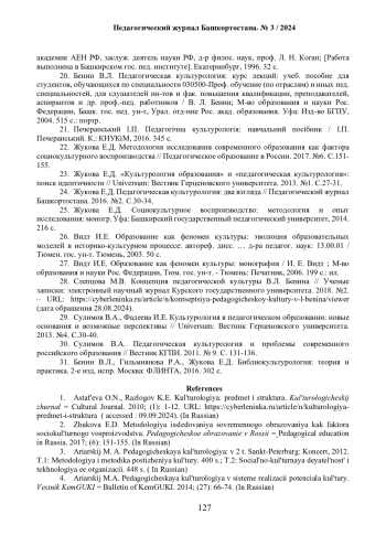 6. Бенин В.Л., Жукова Е.Д. Педагогическая культурология в системе исследования образования // Вестник Башкирского педагогического университета им. М. Акмуллы. 2023. Т.2, №S1 С.49-54.