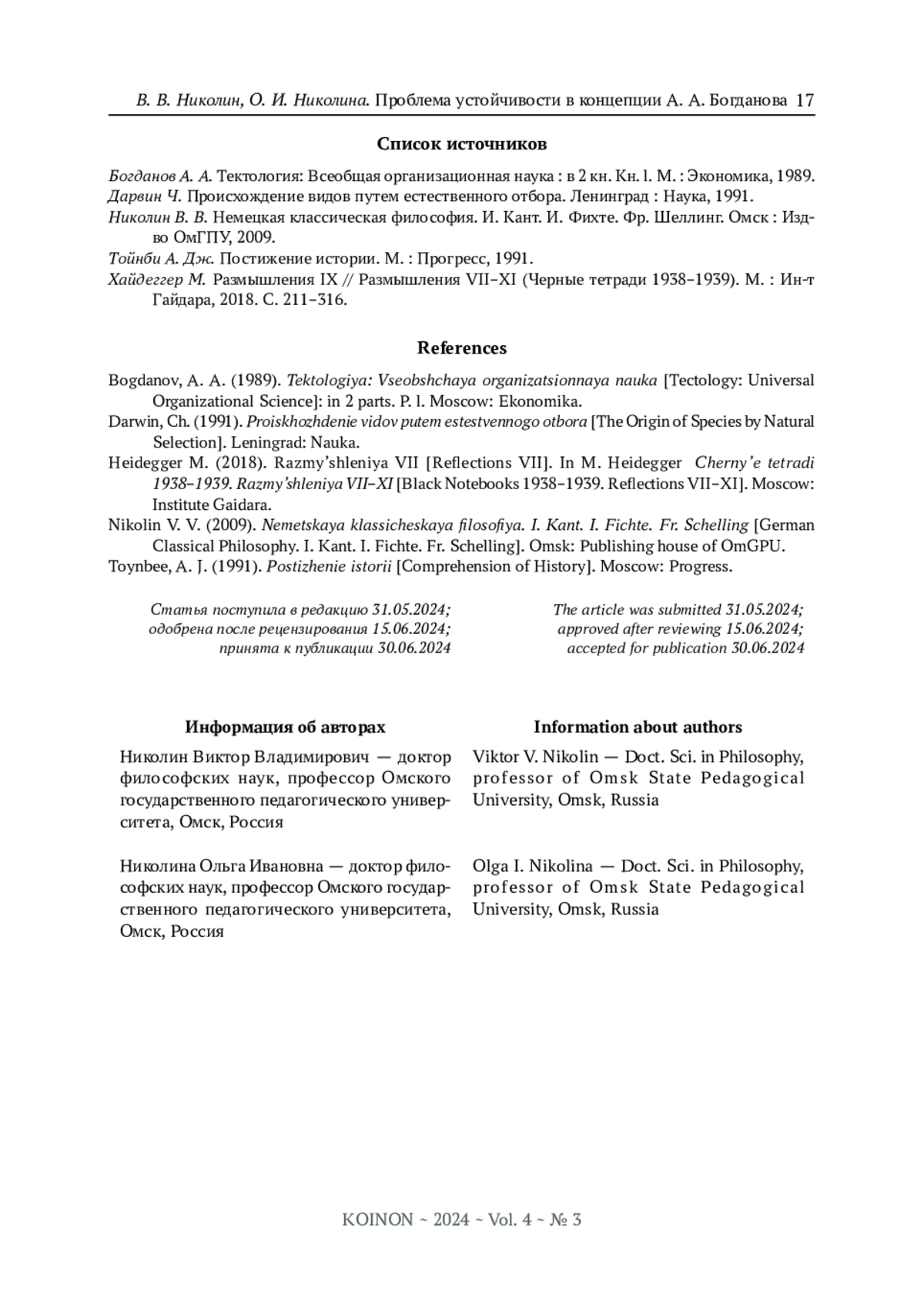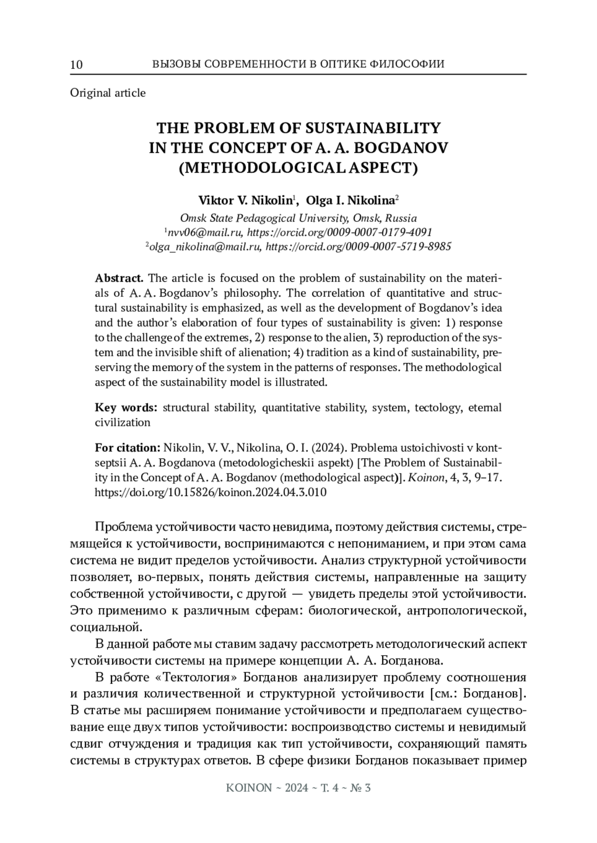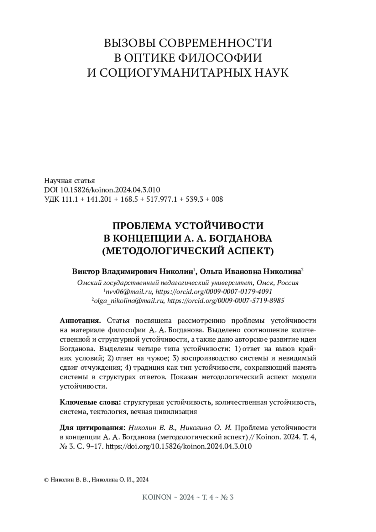 Статья посвящена рассмотрению проблемы устойчивости на материале философии А. А. Богданова. Выделено соотношение количественной и структурной устойчивости, а также дано авторское развитие идеи Богданова. Выделены четыре типа устойчивости: 1) ответ на вызов крайних условий; 2) ответ на чужое; 3) воспроизводство системы и невидимый сдвиг отчуждения; 4) традиция как тип устойчивости, сохраняющий память системы в структурах ответов. Показан методологический аспект модели устойчивости.