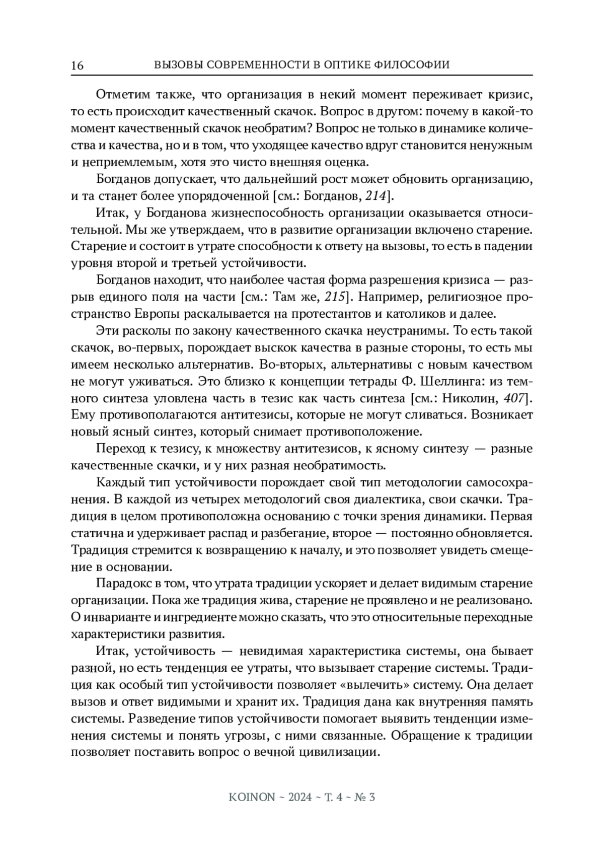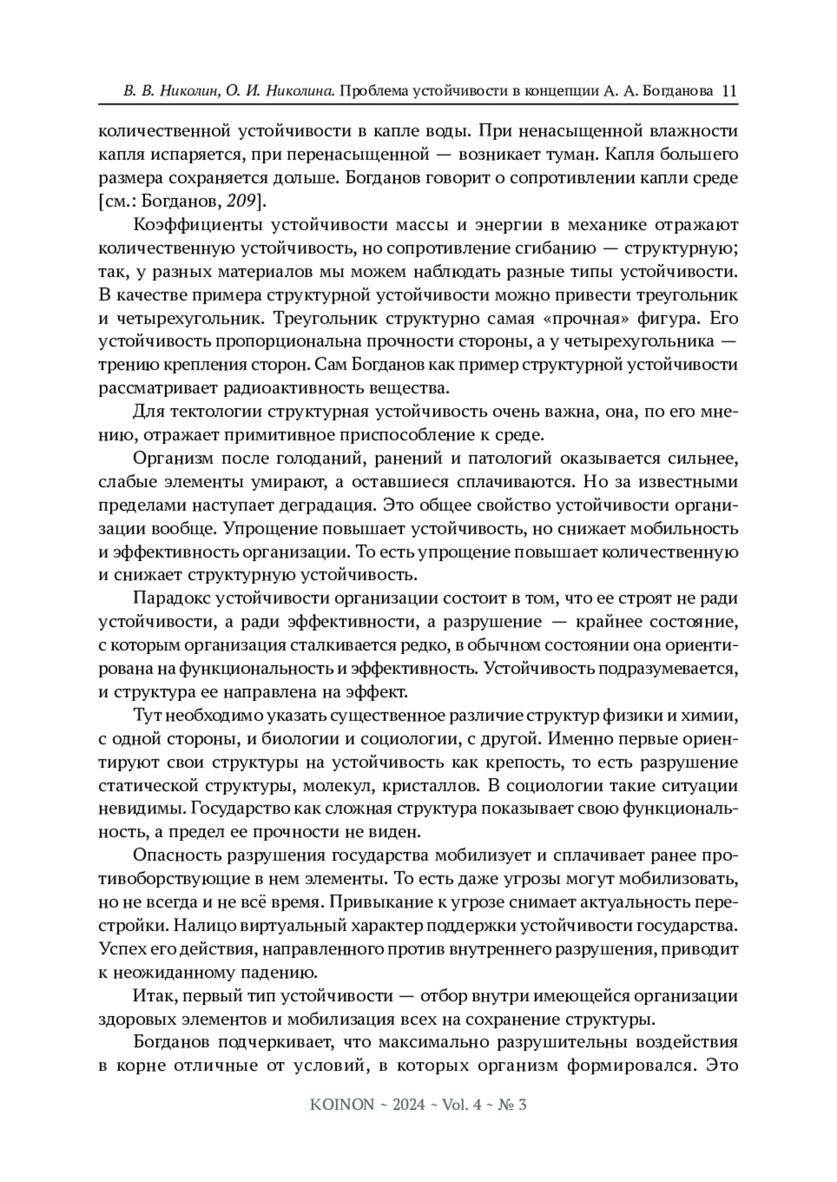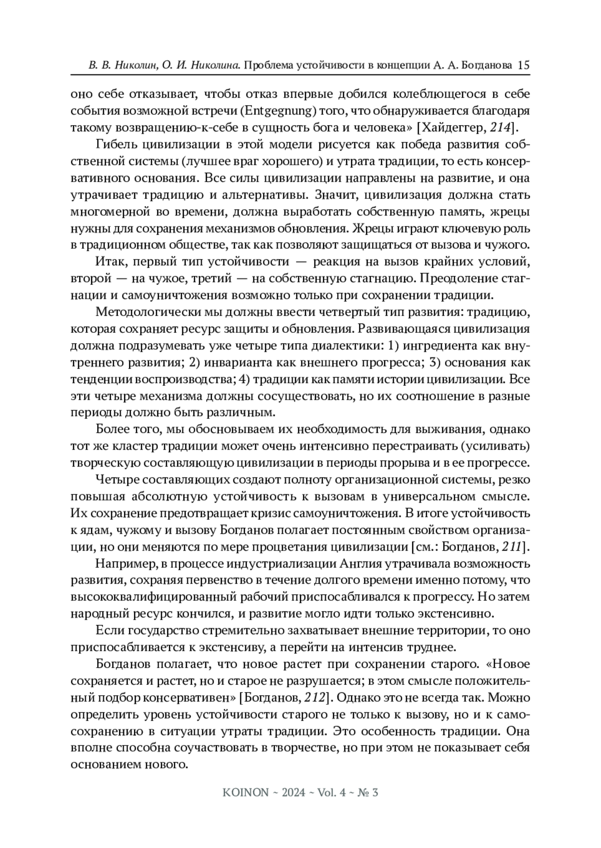 Статья посвящена рассмотрению проблемы устойчивости на материале философии А. А. Богданова. Выделено соотношение количественной и структурной устойчивости, а также дано авторское развитие идеи Богданова. Выделены четыре типа устойчивости: 1) ответ на вызов крайних условий; 2) ответ на чужое; 3) воспроизводство системы и невидимый сдвиг отчуждения; 4) традиция как тип устойчивости, сохраняющий память системы в структурах ответов. Показан методологический аспект модели устойчивости.