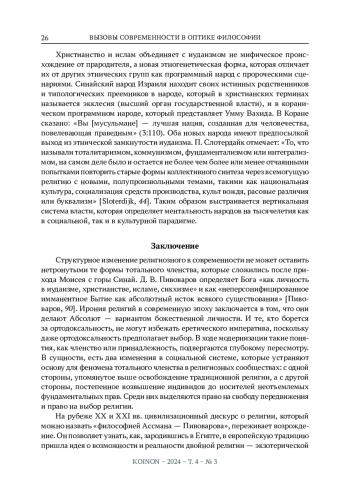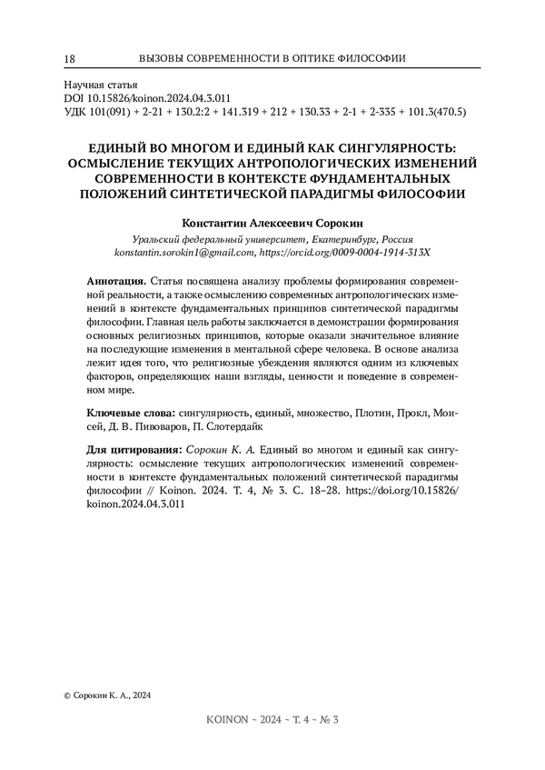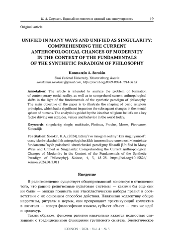 Статья посвящена анализу проблемы формирования современной реальности, а также осмыслению современных антропологических изменений в контексте фундаментальных принципов синтетической парадигмы философии. Главная цель работы заключается в демонстрации формирования основных религиозных принципов, которые оказали значительное влияние на последующие изменения в ментальной сфере человека. В основе анализа лежит идея того, что религиозные убеждения являются одним из ключевых факторов, определяющих наши взгляды, ценности и поведение в современном мире.
