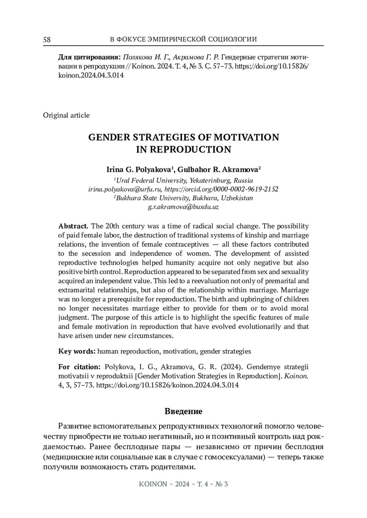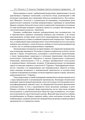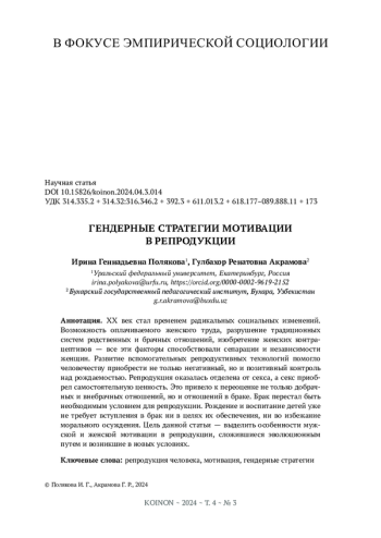 XX век стал временем радикальных социальных изменений. Возможность оплачиваемого женского труда, разрушение традиционных систем родственных и брачных отношений, изобретение женских контрацептивов - все эти факторы способствовали сепарации и независимости женщин. Развитие вспомогательных репродуктивных технологий помогло человечеству приобрести не только негативный, но и позитивный контроль над рождаемостью. Репродукция оказалась отделена от секса, а секс приобрел самостоятельную ценность. Это привело к переоценке не только добрачных и внебрачных отношений, но и отношений в браке. Брак перестал быть необходимым условием для репродукции. Рождение и воспитание детей уже не требует вступления в брак ни в целях их обеспечения, ни во избежание морального осуждения. Цель данной статьи - выделить особенности мужской и женской мотивации в репродукции, сложившиеся эволюционным путем и возникшие в новых условиях.