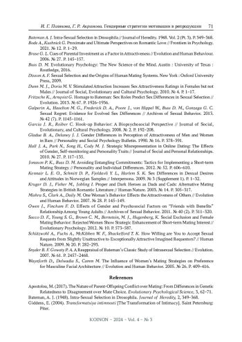 9. Fritzsche K., Arnqvist G. Homage to Bateman: Sex Roles Predict Sex Differences in Sexual Selection // Evolution. 2013. № 67. Р. 1926-1936.