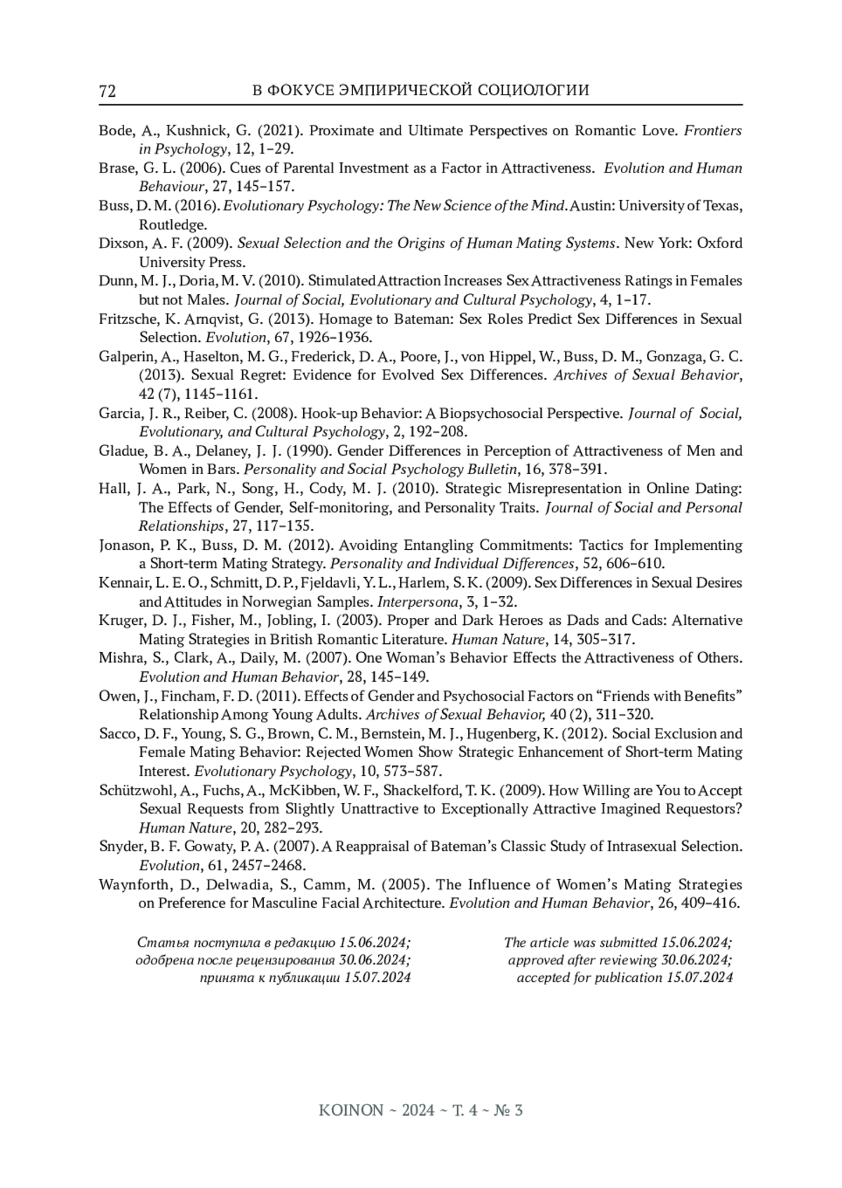 14. Jonason P. K., Buss D. M. Avoiding Entangling Commitments: Tactics for Implementing a Short-term Mating Strategy // Personality and Individual Differences. 2012. № 52. Р. 606-610.