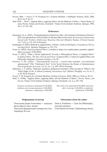 Ключевые фразы: ПРИКЛАДНАЯ ЭТИКА, социальная философия, этика искусственного интеллекта, биоэтика, этическая теория, социальность