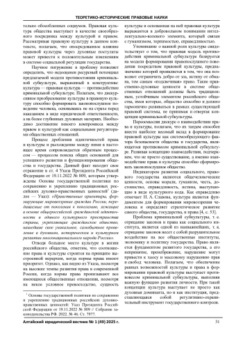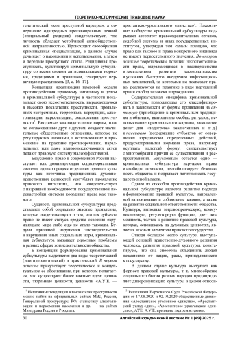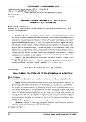 В статье рассмотрено развитие концепции взаимодействия культуры и права как модели противодействия криминальной субкультуре. Идеализация верховенства права показывает свою несостоятельность. Высокие показатели преступности, проявления экстремизма, терроризма, коррупции свидетельствуют о негативном влиянии криминальной субкультуры. Описывается взаимосвязь культуры и права как основание формирования правовой культуры. Предлагается конструктив модели взаимодействия, где культура, выступая форпостом правовой культуры, способна оказать эффективное противодействие криминальной субкультуре. Правовая культура общества выступает в качестве посредника между культурой и правом, который способен минимизировать влияние криминальной субкультуры и сформировать законопослушное общество. Исследование основывается на применении общенаучных методов: анализа, синтеза, индукции, дедукции, аналогии; используется качественный социологический и криминологический анализ содержания академических текстов, а также применяется сравнительно-правовой анализ нормативно-правовых актов.