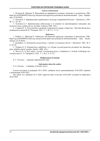 3. Телегина Е. Г. Криминальная субкультура и ее влияние на противоправное поведение лиц женского пола: учебно-метод. пособие. Саратов, 2009. 104 с. EDN: NHQEVT