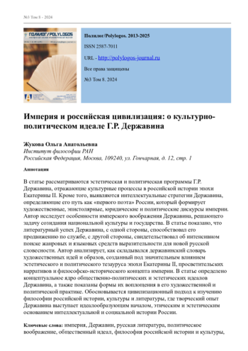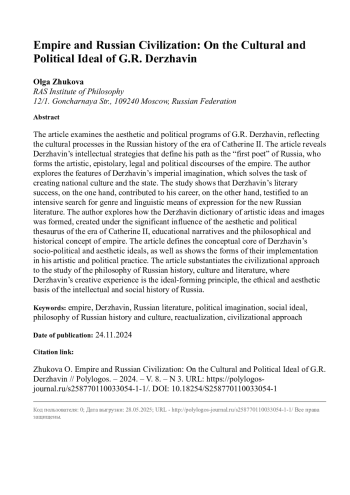 В статье рассматриваются эстетическая и политическая программы Г. Р. Державина, отражающие культурные процессы в российской истории эпохи Екатерины II. Кроме того, выявляются интеллектуальные стратегии Державина, определяющие его путь как «первого поэта» России, который формирует художественные, эпистолярные, юридические и политические дискурсы империи. Автор исследует особенности имперского воображения Державина, решающего задачу созидания национальной культуры и государства. В статье показано, что литературный успех Державина, с одной стороны, способствовал его продвижению по службе, с другой стороны, свидетельствовал об интенсивном поиске жанровых и языковых средств выразительности для новой русской словесности. Автор анализирует, как складывался державинский словарь художественных идей и образов, созданный под значительным влиянием эстетического и политического тезауруса эпохи Екатерины II, просветительских нарративов и философско-исторического концепта империи. В статье определено концептуальное ядро общественно-политических и эстетических идеалов Державина, а также показаны формы их воплощения в его художественной и политической практике. Обосновывается цивилизационный подход к изучению философии российской истории, культуры и литературы, где творческий опыт Державина выступает идеалообразующим началом, этическим и эстетическим основанием интеллектуальной и социальной истории России.