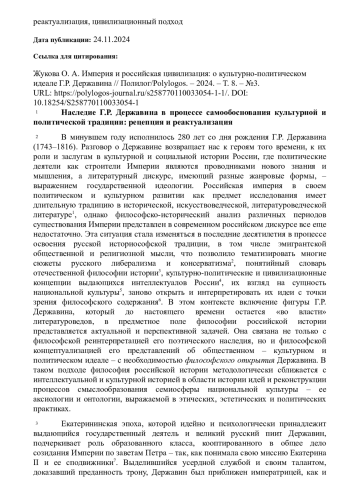 25. Кара-Мурза А.А. Россия как “Север”. Метаморфозы национальной идентичности в XVIII-XIX вв.: Г.Р. Державин // Философские науки. 2017. № 8. С. 121-134. EDN: ZSUVPP