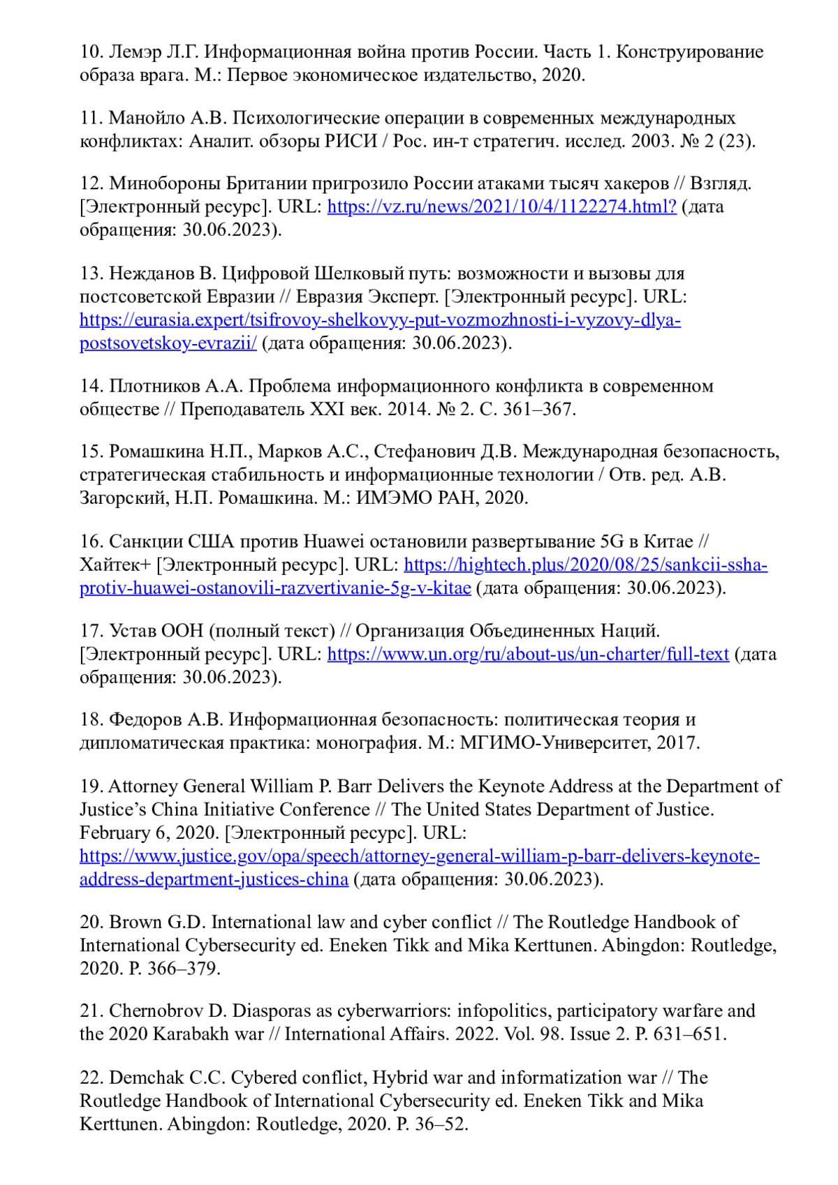 12. Минобороны Британии пригрозило России атаками тысяч хакеров // Взгляд. [Электронный ресурс]. URL: https://vz.ru/news/2021/10/4/1122274.html? (дата обращения: 30.06.2023).