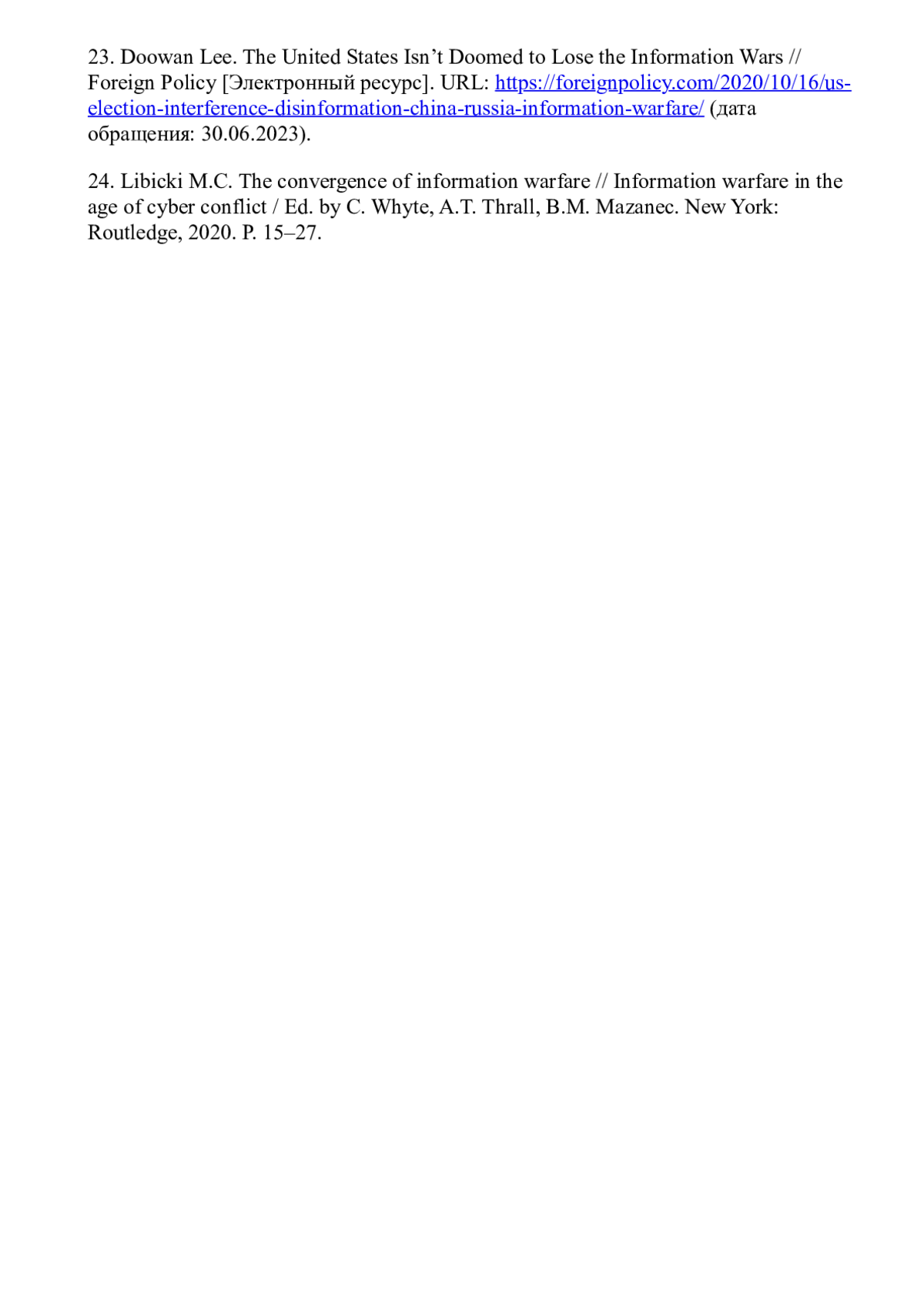 23. Doowan Lee. The United States Isn’t Doomed to Lose the Information Wars // Foreign Policy [Электронный ресурс]. URL: https://foreignpolicy.com/2020/10/16/us-election-interference-disinformation-china-russia-information-warfare/ (дата обращения: 30.06.2023).