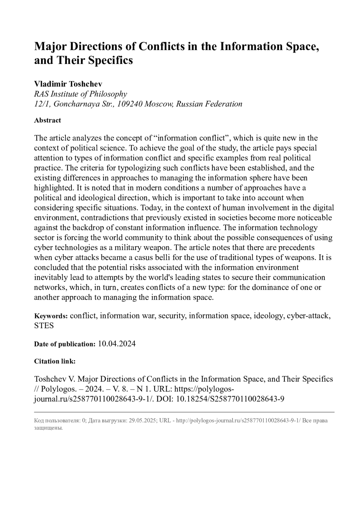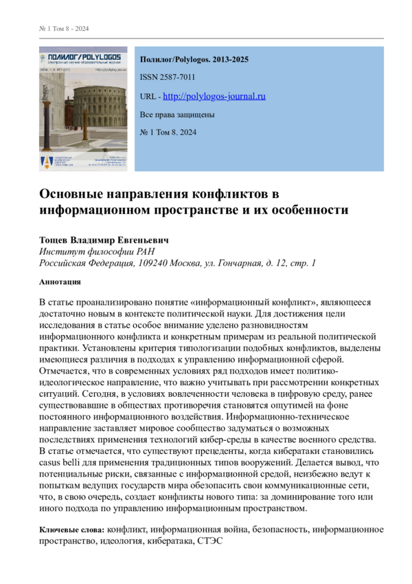 В статье проанализировано понятие «информационный конфликт», являющееся достаточно новым в контексте политической науки. Для достижения цели исследования в статье особое внимание уделено разновидностям информационного конфликта и конкретным примерам из реальной политической практики. Установлены критерия типологизации подобных конфликтов, выделены имеющиеся различия в подходах к управлению информационной сферой. Отмечается, что в современных условиях ряд подходов имеет политико-идеологическое направление, что важно учитывать при рассмотрении конкретных ситуаций. Сегодня, в условиях вовлеченности человека в цифровую среду, ранее существовавшие в обществах противоречия становятся ощутимей на фоне постоянного информационного воздействия. Информационно-техническое направление заставляет мировое сообщество задуматься о возможных последствиях применения технологий кибер-среды в качестве военного средства. В статье отмечается, что существуют прецеденты, когда кибератаки становились casus belli для применения традиционных типов вооружений. Делается вывод, что потенциальные риски, связанные с информационной средой, неизбежно ведут к попыткам ведущих государств мира обезопасить свои коммуникационные сети, что, в свою очередь, создает конфликты нового типа: за доминирование того или иного подхода по управлению информационным пространством.