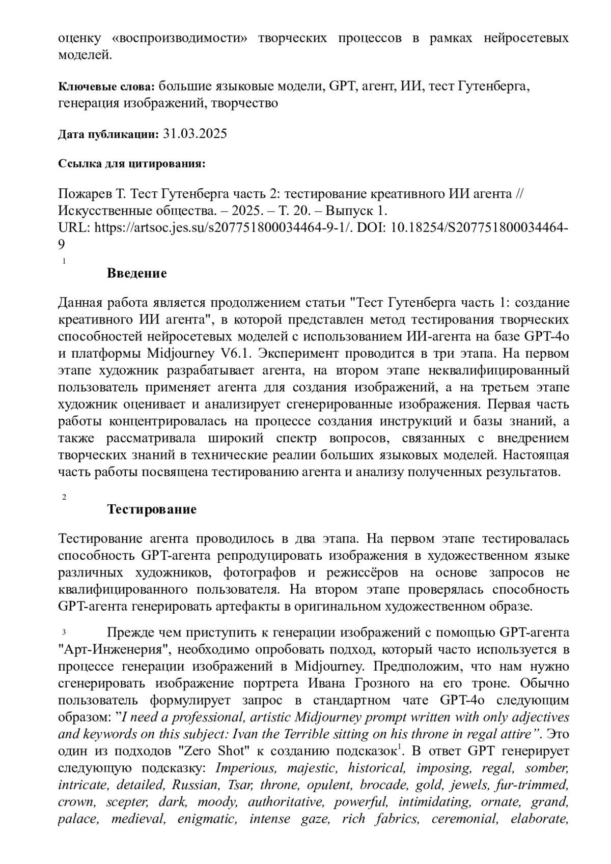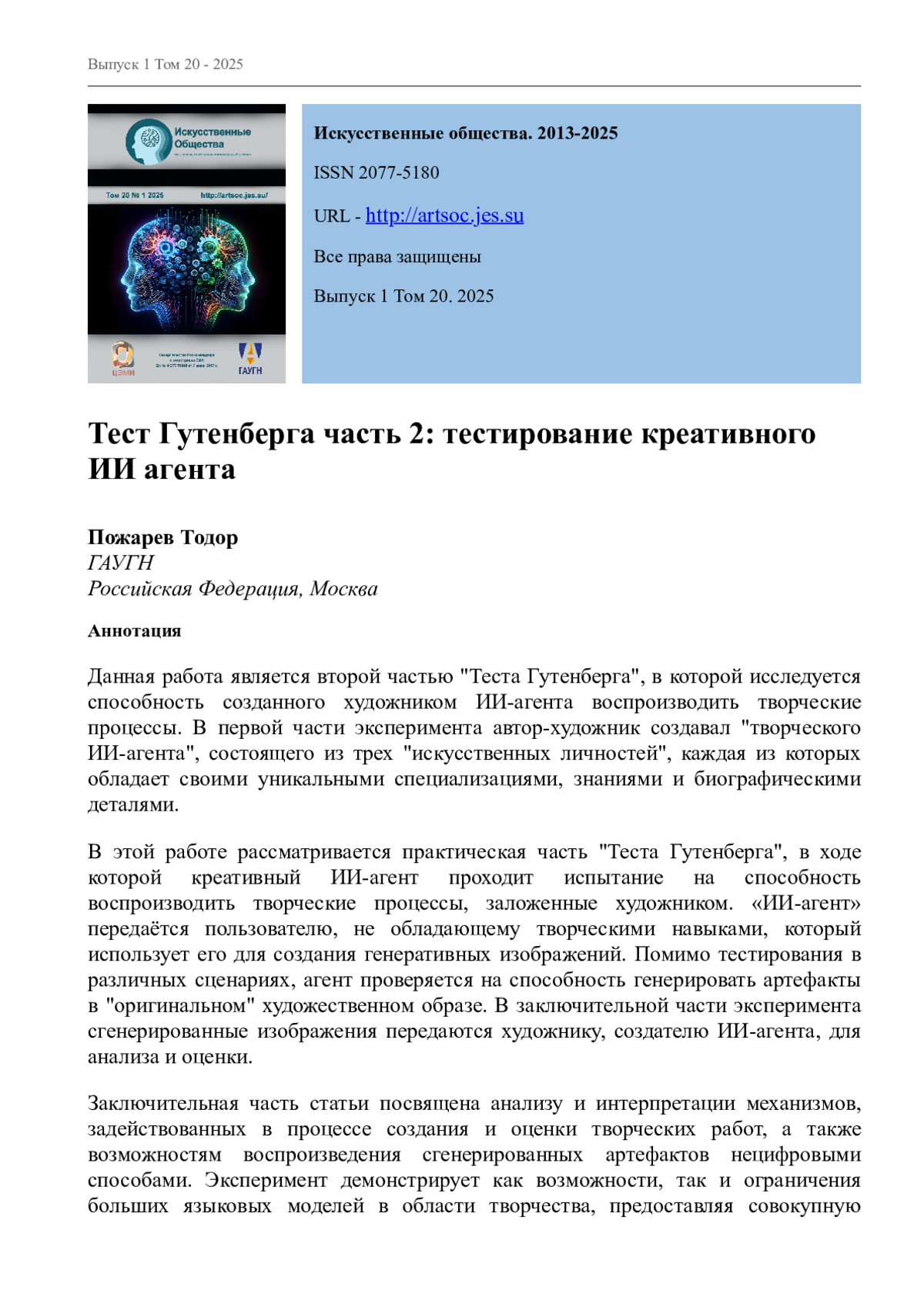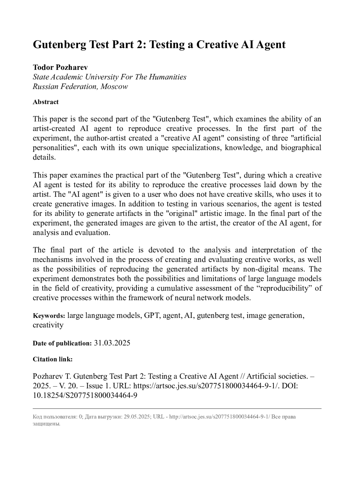 Данная работа является второй частью “Теста Гутенберга”, в которой исследуется способность созданного художником ИИ-агента воспроизводить творческие процессы. В первой части эксперимента автор-художник создавал “творческого ИИ-агента”, состоящего из трех “искусственных личностей”, каждая из которых обладает своими уникальными специализациями, знаниями и биографическими деталями. В этой работе рассматривается практическая часть “Теста Гутенберга”, в ходе которой креативный ИИ-агент проходит испытание на способность воспроизводить творческие процессы, заложенные художником. «ИИ-агент» передаётся пользователю, не обладающему творческими навыками, который использует его для создания генеративных изображений. Помимо тестирования в различных сценариях, агент проверяется на способность генерировать артефакты в “оригинальном” художественном образе. В заключительной части эксперимента сгенерированные изображения передаются художнику, создателю ИИ-агента, для анализа и оценки. Заключительная часть статьи посвящена анализу и интерпретации механизмов, задействованных в процессе создания и оценки творческих работ, а также возможностям воспроизведения сгенерированных артефактов нецифровыми способами. Эксперимент демонстрирует как возможности, так и ограничения больших языковых моделей в области творчества, предоставляя совокупную оценку «воспроизводимости» творческих процессов в рамках нейросетевых моделей.