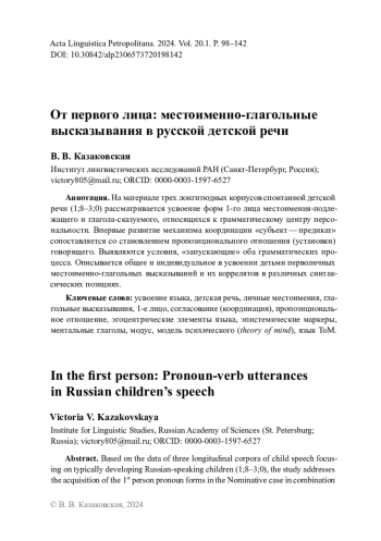 На материале трех лонгитюдных корпусов спонтанной детской речи (1;8–3;0) рассматривается усвоение форм 1-го лица местоимения-подлежащего и глагола-сказуемого, относящихся к грамматическому центру персональности. Впервые развитие механизма координации «субъект — предикат» сопоставляется со становлением пропозиционального отношения (установки) говорящего. Выявляются условия, «запускающие» оба грамматических процесса. Описывается общее и индивидуальное в усвоении детьми перволичных местоименно-глагольных высказываний и их коррелятов в различных синтаксических позициях.