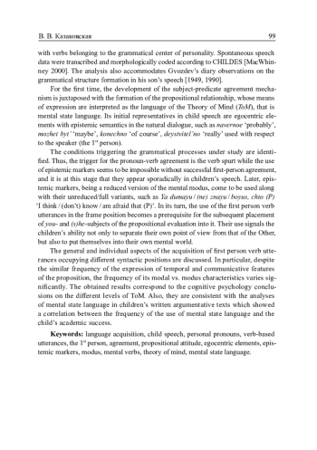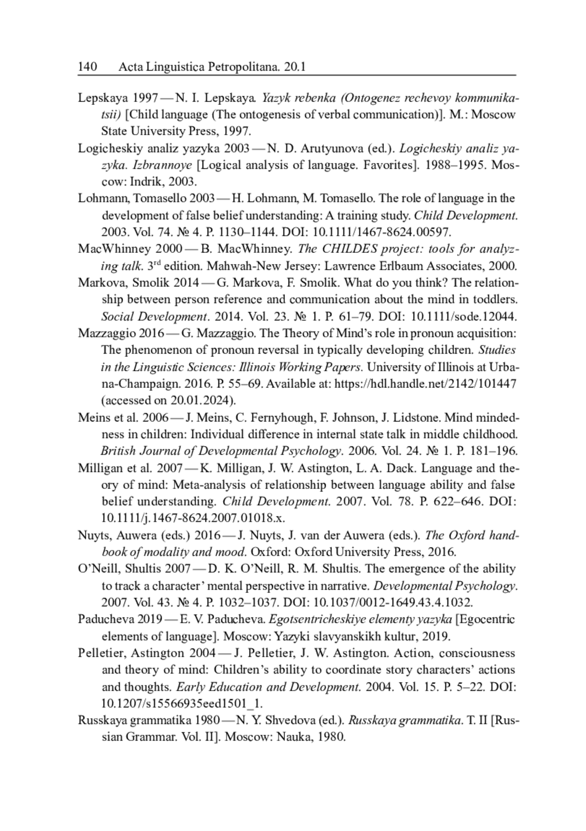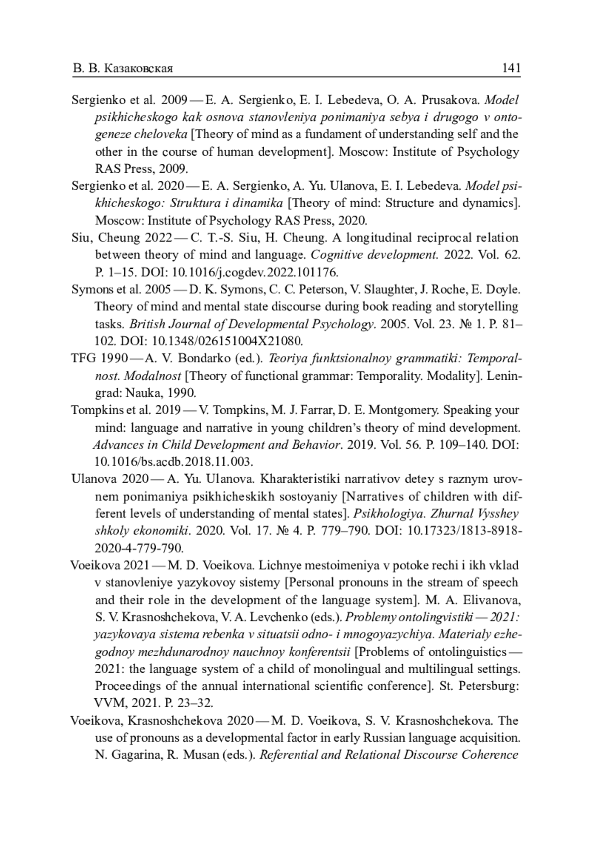 - Kazakovskaya 2020 — V. Kazakovskaya. Epistemic modality in the speech of Russian young children and adolescents // Philologia Estonica Tallinnensis. Languages, orderings and successions. 2020. Vol. 5. Р. 134–166. DOI: 10.22601/ PET.2020.05.05.