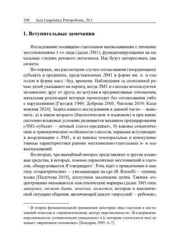 Исследование посвящено глагольным высказываниям с личными местоимениями 1-го лица (далее ЛМ1), функционирующими на начальных стадиях речевого онтогенеза. Нас будут интересовать два сюжета.