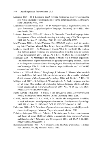 - Markova, Smolik 2014 — G. Markova, F. Smolik. What do you think? The relationship between person reference and communication about the mind in toddlers // Social Development. 2014. Vol. 23. № 1. P. 61–79. DOI: 10.1111/sode.12044.