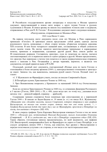 На первом титульном листе документа после слов «из Москвы в Рим» карандашом приписано «Гоголю». В оригинале список представляет собой девять сшитых листов рукописного текста, исписанных с обеих сторон четким, убористым почерком середины ХIХ столетия. В нем более четырехсот названий книг, составляющих в общей сложности около тысячи томов. На листах имеются многочисленные чернильные и карандашные пометы, приписки и исправления, сделанные другой рукой. Весь список разбит на IX тематических разрядов. Составитель «реестра», судя по пометкам на листах, пытался систематизировать его и переносил книги из одного разряда в другой. Можно предположить, что «реестр» был переписан с учетом этих пометок и в таком упорядоченном виде отправлен вместе с книгами в Рим. Оставшийся у автора черновик, вероятно, и является тем документом, который хранится ныне в РГАЛИ.