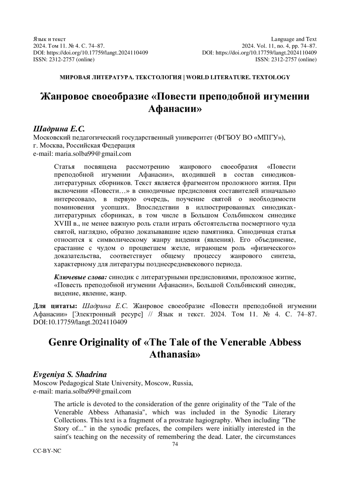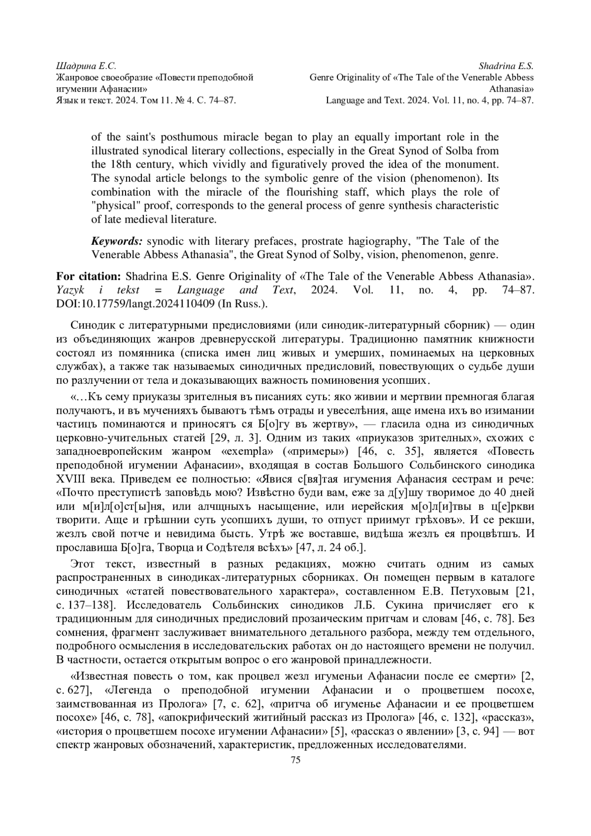 Статья посвящена рассмотрению жанрового своеобразия «Повести преподобной игумении Афанасии», входившей в состав синодиков-литературных сборников. Текст является фрагментом проложного жития. При включении «Повести…» в синодичные предисловия составителей изначально интересовало, в первую очередь, поучение святой о необходимости поминовения усопших. Впоследствии в иллюстрированных синодиках-литературных сборниках, в том числе в Большом Сольбинском синодике XVIII в., не менее важную роль стали играть обстоятельства посмертного чуда святой, наглядно, образно доказывавшие идею памятника. Синодичная статья относится к символическому жанру видения (явления). Его объединение, срастание с чудом о процветшем жезле, играющем роль «физического» доказательства, соответствует общему процессу жанрового синтеза, характерному для литературы позднесредневекового периода.