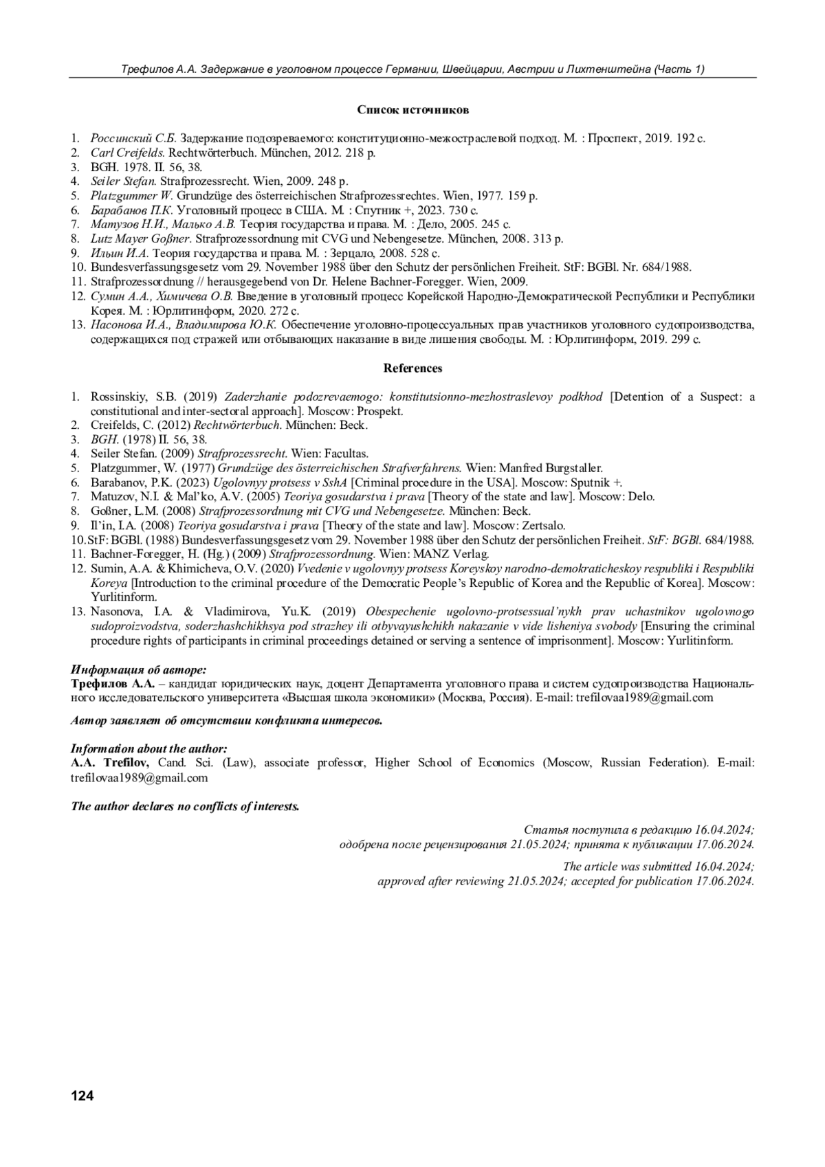 1. Россинский С.Б. Задержание подозреваемого: конституционно-межостраслевой подход. М.: Проспект, 2019. 192 с. EDN: YYMNBB