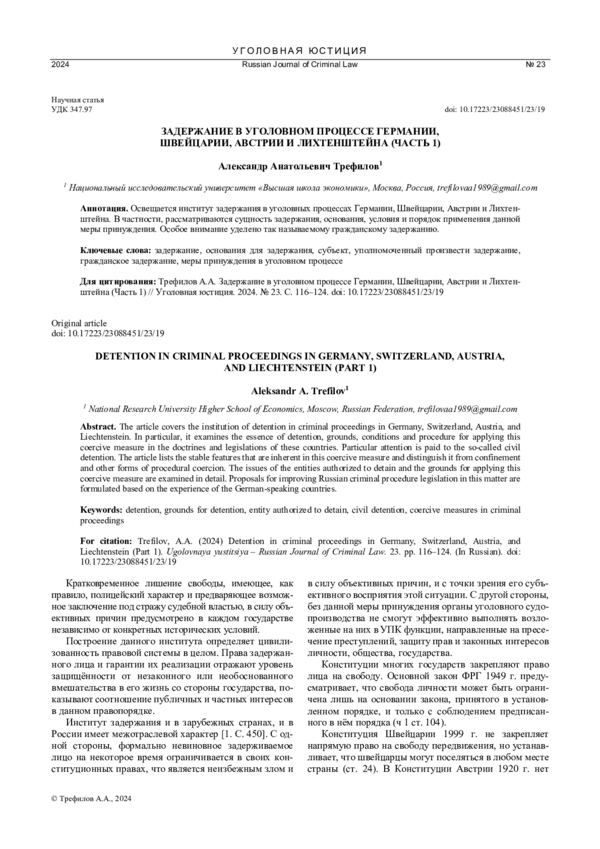 Освещается институт задержания в уголовных процессах Германии, Швейцарии, Австрии и Лихтенштейна. В частности, рассматриваются сущность задержания, основания, условия и порядок применения данной меры принуждения. Особое внимание уделено так называемому гражданскому задержанию. Автор заявляет об отсутствии конфликта интересов.