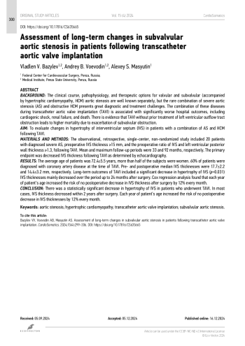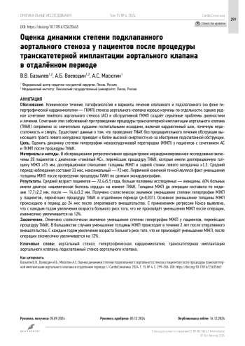 Ряд патологий сердечно-сосудистой системы препятствует выбросу левого желудочка (ЛЖ), наиболее частыми являются клапанный и подклапанный (на фоне гипертрофической кардиомиопатии — ГКМП) стенозы. Клиническое течение, патофизиология и варианты лечения хорошо изучены в обеих группах по отдельности, однако редкое сочетание тяжёлого аортального стеноза и обструктивной ГКМП создаёт серьёзные проблемы диагностики и лечения с важными прогностическими последствиями [1]. А сочетание у пациента этих заболеваний при проведении транскатетерной имплантации аортального клапана (ТИАК) сопряжено со значительно худшими госпитальными исходами, включая кардиогенный шок, почечную недостаточность и смерть [2]. Существуют данные о том, что проведение процедуры ТИАК без предварительного лечения обструкции выносящего тракта ЛЖ может привести к более высокой смертности из-за обострения подклапанной обструкции [1, 2]. С другой стороны, группа авторов из Шаньдунского университета в 2024 г. опубликовала клинический случай успешной ТИАК с глубокой имплантацией протеза, что привело к успешной коррекции клапанного и подклапанного стенозов [3]. Стоит отметить, что при анализе литературы не найдено описания критериев отказа от процедуры ТИАК на основании толщины межжелудочковой перегородки (МЖП). Также в литературе описана методика, при которой данной группе пациентов превентивно выполняют спиртовую септальную аблацию с хорошими клиническими результатами. Ограничением для проведения такого вмешательства будет служить отсутствие перфорантных внутриперегородочных ветвей более 1 мм [4, 5].