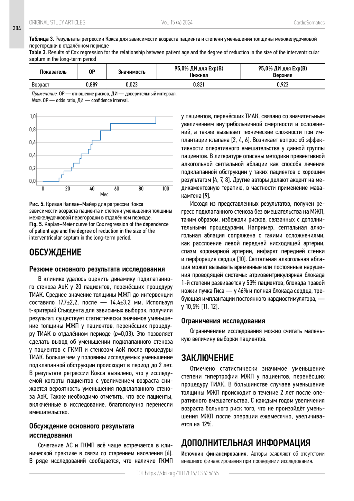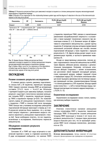 Заключение. Отмечено статистически значимое уменьшение степени гипертрофии МЖП у пациентов, перенёсших процедуру ТИАК. В большинстве случаев уменьшение толщины МЖП происходит в течение 2 лет после оперативного вмешательства. С каждым годом увеличения возраста больного риск того, что не произойдёт уменьшение МЖП, после операции ежемесячно увеличивается на 12%