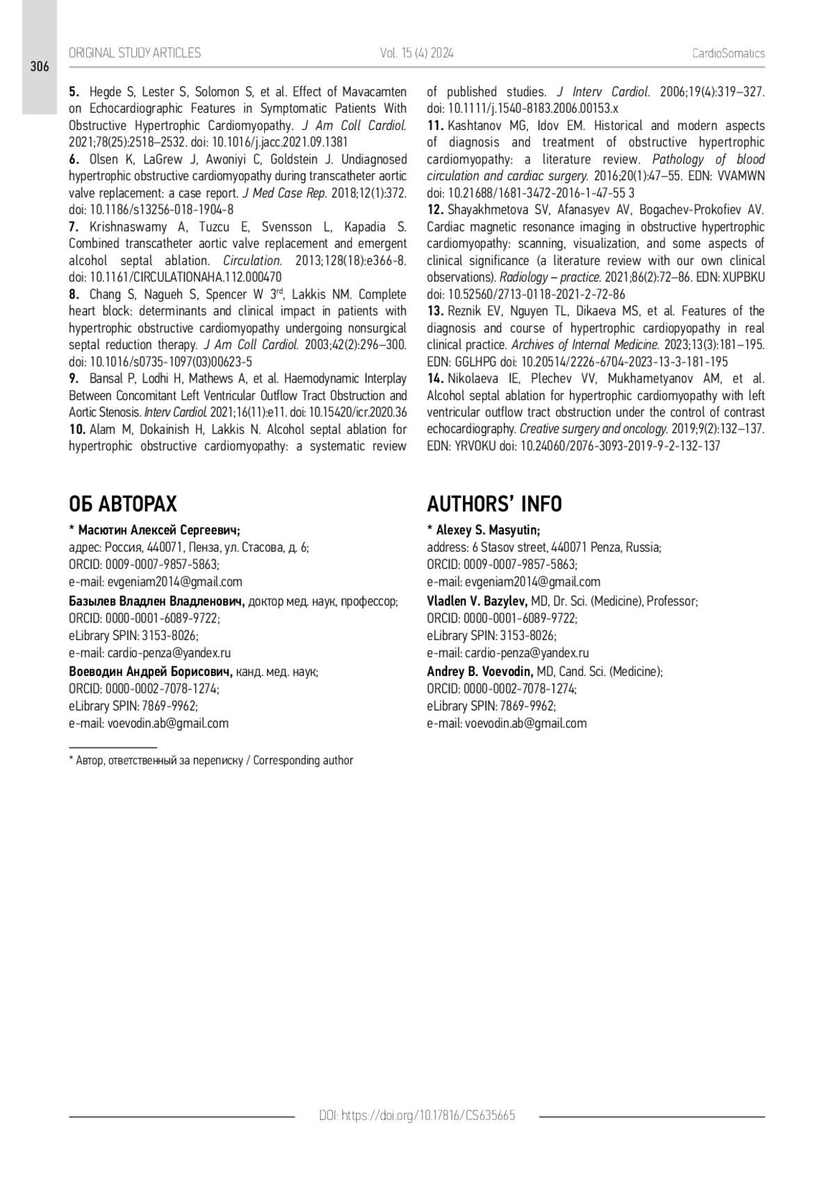 11. Каштанов М.Г., Идов Э.М. Исторические и современные аспекты диагностики и лечения обструктивной гипертрофической кардиомиопатии: обзор литературы // Патология кровообращения и кардиохирургия. 2016. Т. 20, № 1. С. 47–55. EDN: VVAMWN doi: 10.21688/1681-3472-2016-1-47-55