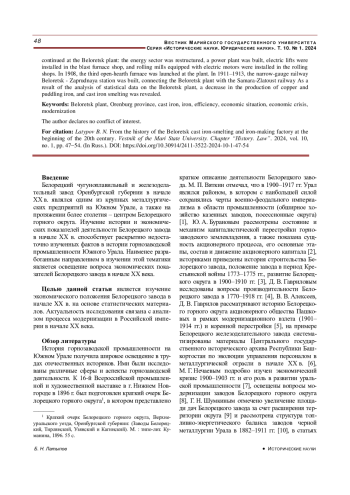 Белорецкий чугуноплавильный и железоделательный завод Оренбургской губернии в начале ХХ в. являлся одним из крупных металлургических предприятий на Южном Урале, а также на протяжении более столетия – центром Белорецкого горного округа. Изучение истории и экономических показателей деятельности Белорецкого завода в начале ХХ в. способствует раскрытию недостаточно изученных фактов в истории горнозаводской промышленности Южного Урала. Наименее разработанным направлением в изучении этой тематики является освещение вопроса экономических показателей Белорецкого завода в начале ХХ века.