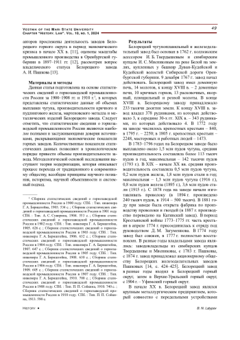 13. Неклюдов Е. Г. Посессионные горные заводы Урала и Замосковья в XIX - начале XX в.: определение статуса // Уральский исторический вестник. 2022. № 2 (75). С. 175-184. URL: item.asp?id=48645453 (дата обращения: 07.11.2023). EDN: FLRQYM