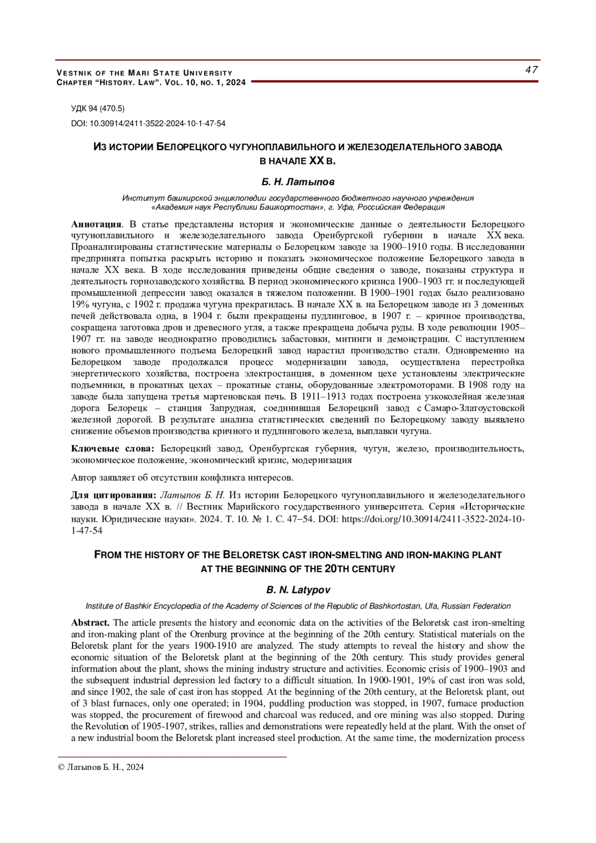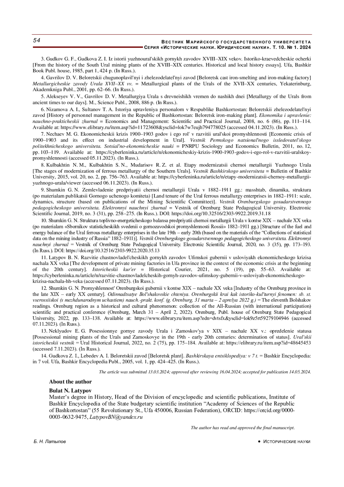 11. Латыпов Б. Н. Развитие частновладельческих горных заводов Уфимской губернии в условиях экономического кризиса начала ХХ века // Исторический курьер. 2021. № 5 (19). С. 55-63. URL: https://cyberleninka.ru/article/n/razvitie-chastnovladelcheskih-gornyh-zavodov-ufimskoy-gubernii-v-usloviyah-ekonomicheskogo-krizisa-nachala-hh-veka (дата обращения: 07.11.2023). EDN: ZILIKG