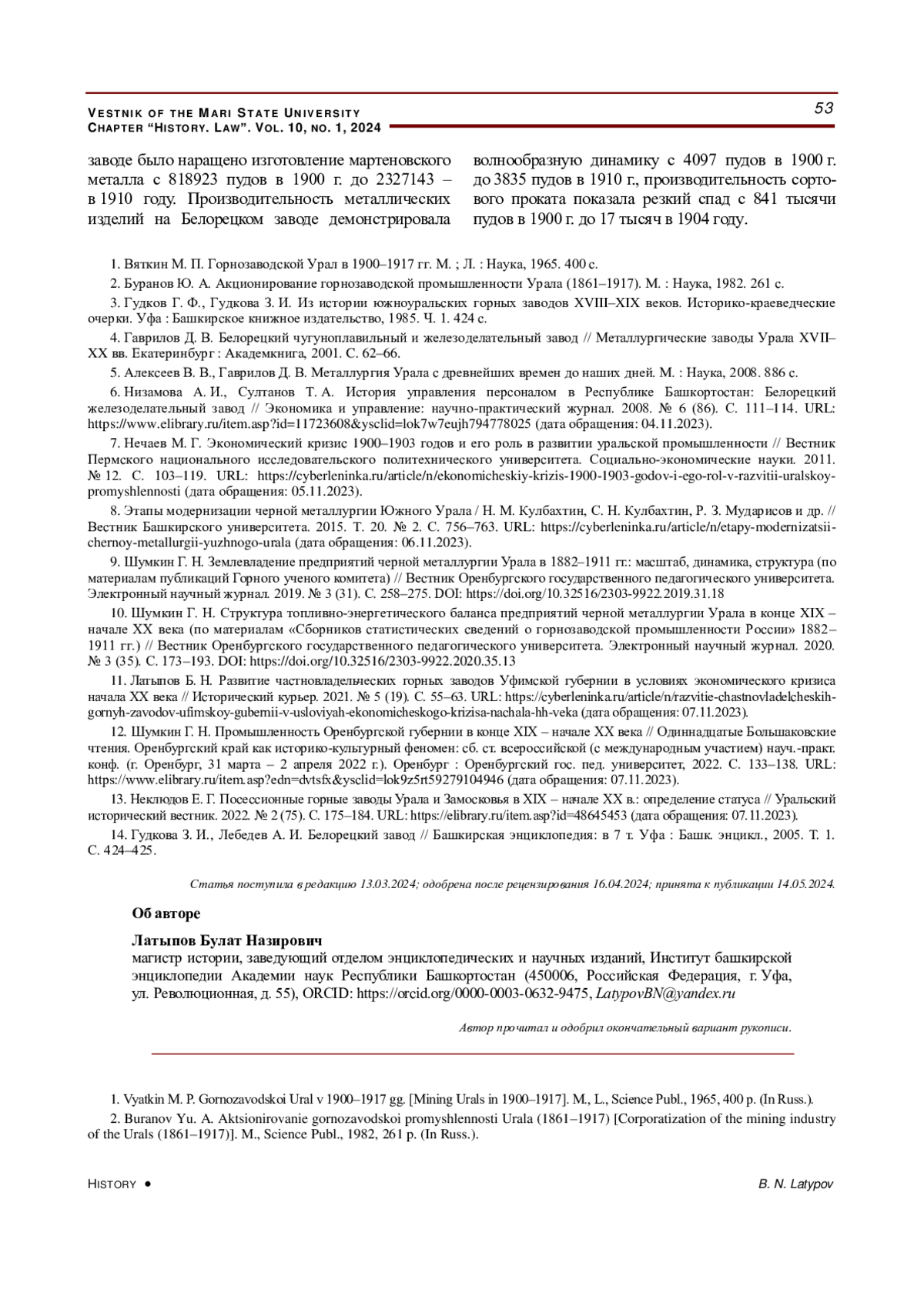 14. Гудкова З. И., Лебедев А. И. Белорецкий завод // Башкирская энциклопедия: в 7 т. Уфа: Башк. энцикл., 2005. Т. 1. С. 424-425. EDN: YLUTPP