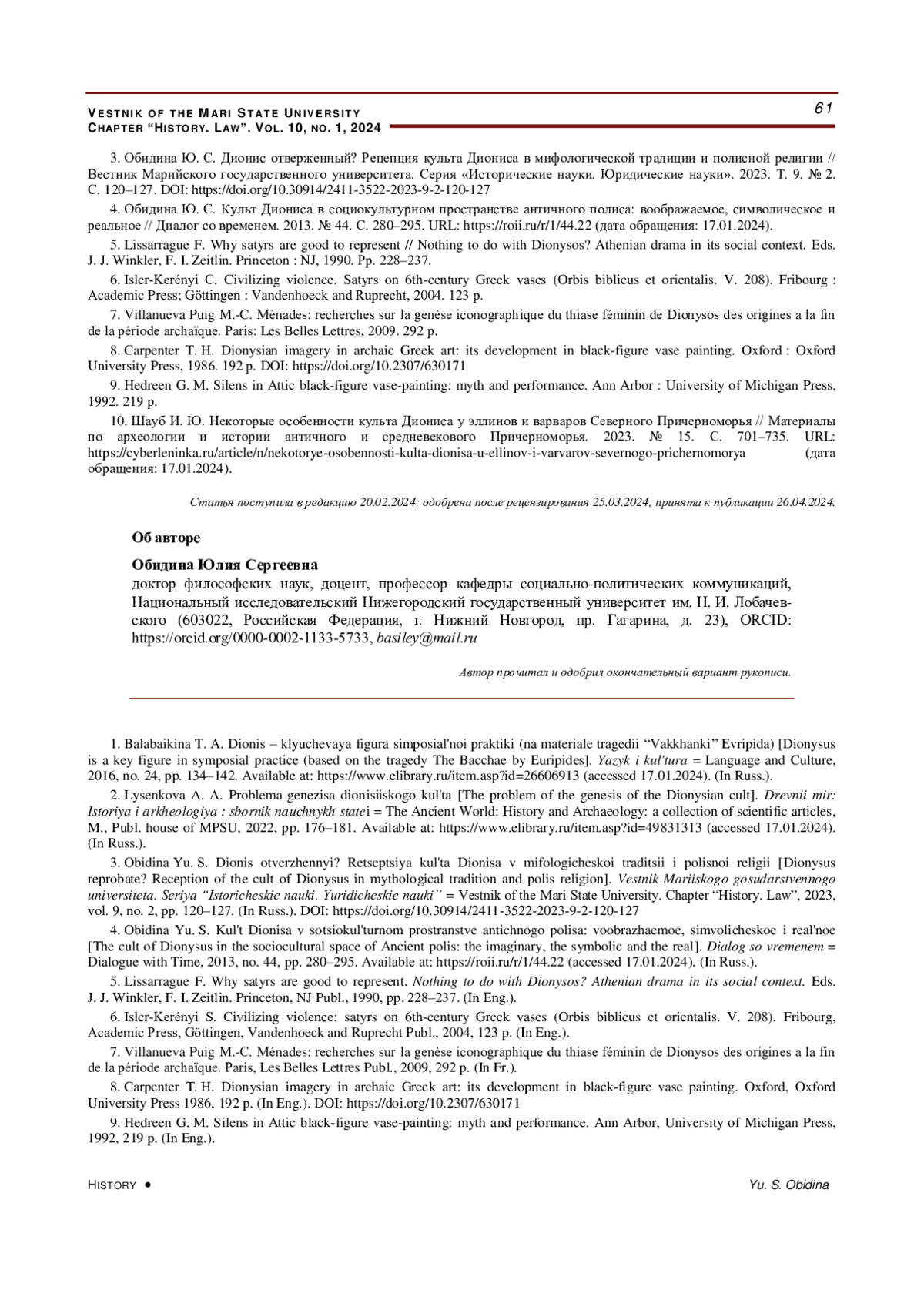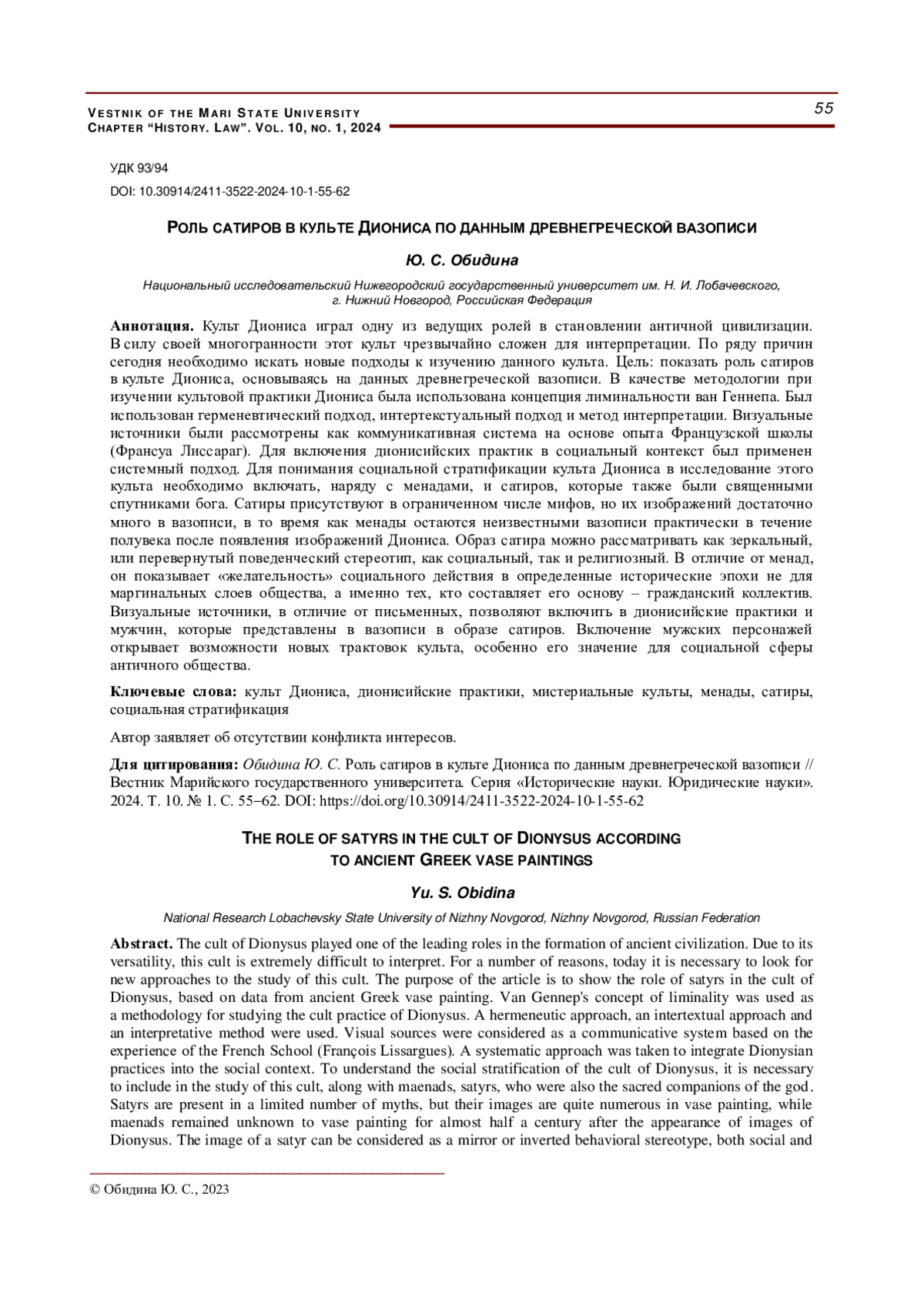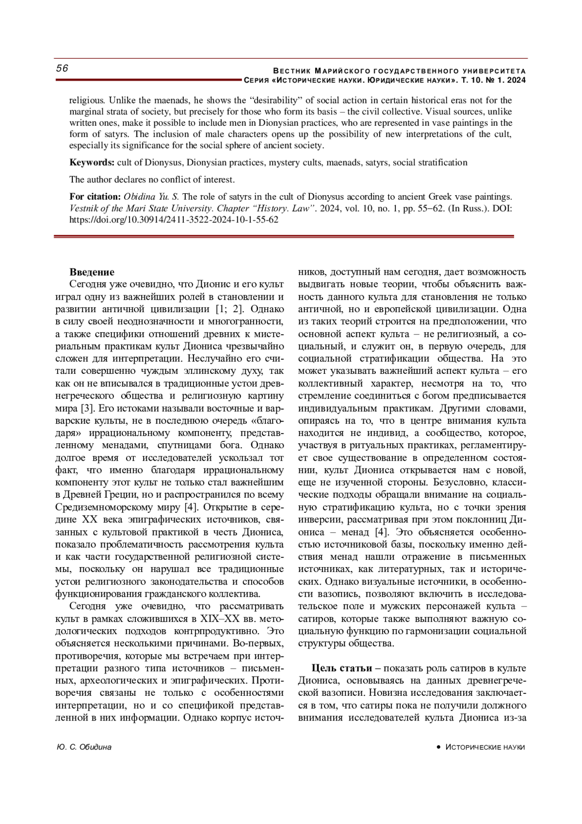Цель: показать роль сатиров в культе Диониса, основываясь на данных древнегреческой вазописи. В качестве методологии при изучении культовой практики Диониса была использована концепция лиминальности ван Геннепа. Был использован герменевтический подход, интертекстуальный подход и метод интерпретации. Визуальные источники были рассмотрены как коммуникативная система на основе опыта Французской школы (Франсуа Лиссараг). Для включения дионисийских практик в социальный контекст был применен системный подход. Для понимания социальной стратификации культа Диониса в исследование этого культа необходимо включать, наряду с менадами, и сатиров, которые также были священными спутниками бога. Сатиры присутствуют в ограниченном числе мифов, но их изображений достаточно много в вазописи, в то время как менады остаются неизвестными вазописи практически в течение полувека после появления изображений Диониса. Образ сатира можно рассматривать как зеркальный, или перевернутый поведенческий стереотип, как социальный, так и религиозный. В отличие от менад, он показывает «желательность» социального действия в определенные исторические эпохи не для маргинальных слоев общества, а именно тех, кто составляет его основу - гражданский коллектив. Визуальные источники, в отличие от письменных, позволяют включить в дионисийские практики и мужчин, которые представлены в вазописи в образе сатиров. Включение мужских персонажей открывает возможности новых трактовок культа, особенно его значение для социальной сферы античного общества.