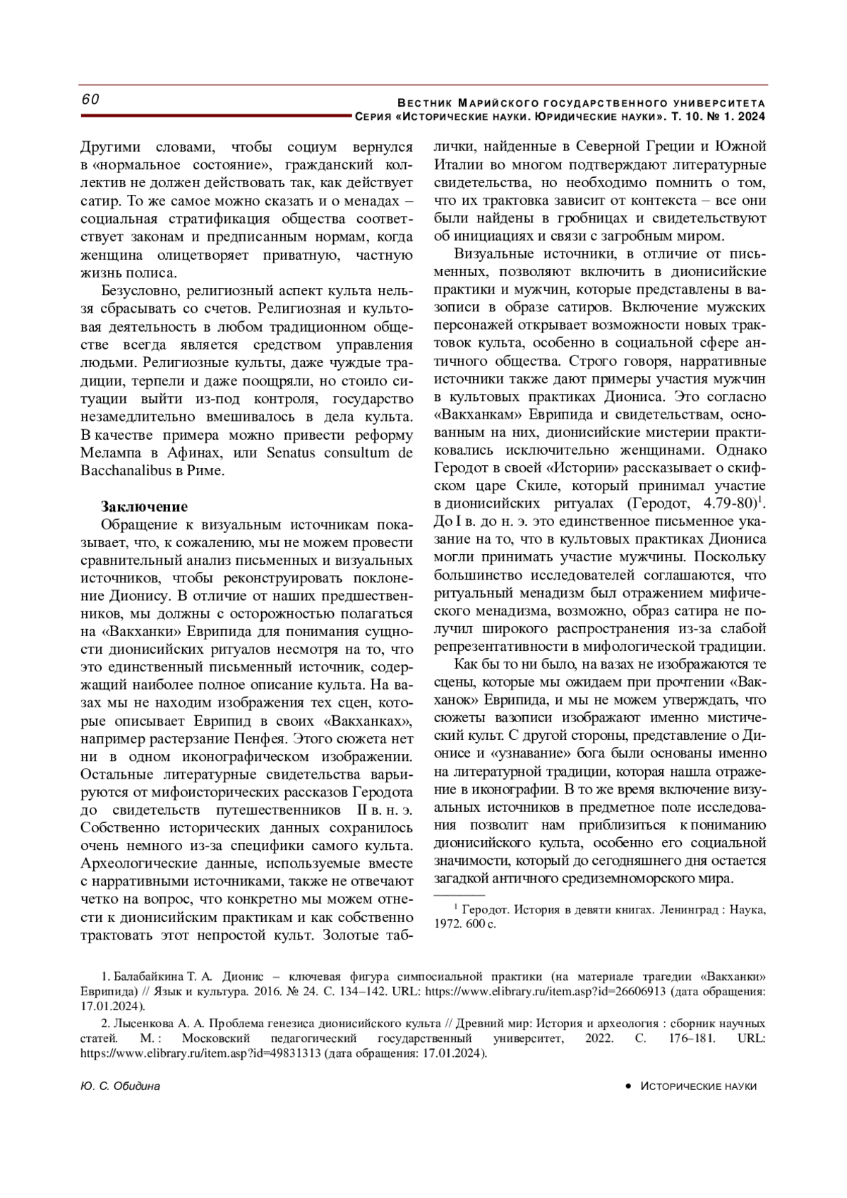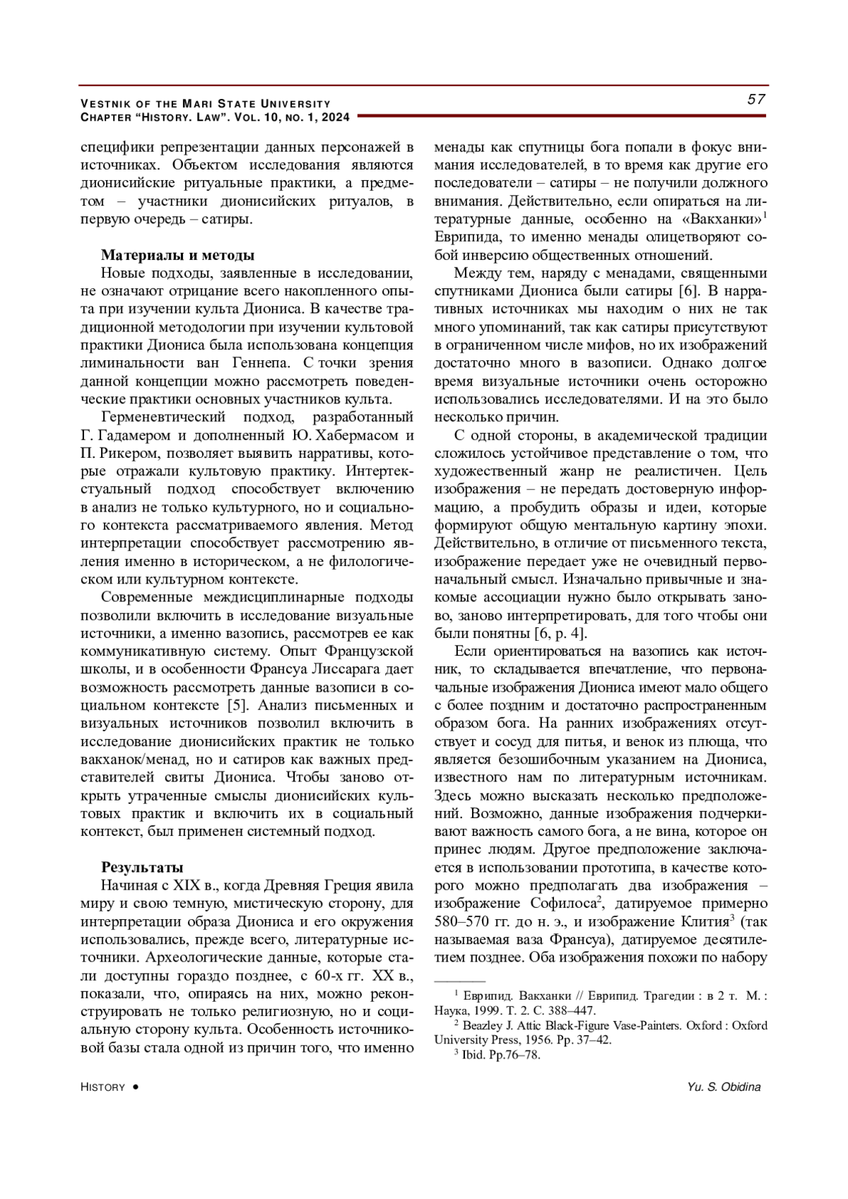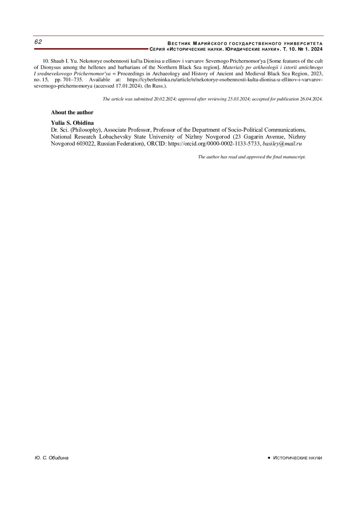 Цель: показать роль сатиров в культе Диониса, основываясь на данных древнегреческой вазописи. В качестве методологии при изучении культовой практики Диониса была использована концепция лиминальности ван Геннепа. Был использован герменевтический подход, интертекстуальный подход и метод интерпретации. Визуальные источники были рассмотрены как коммуникативная система на основе опыта Французской школы (Франсуа Лиссараг). Для включения дионисийских практик в социальный контекст был применен системный подход. Для понимания социальной стратификации культа Диониса в исследование этого культа необходимо включать, наряду с менадами, и сатиров, которые также были священными спутниками бога. Сатиры присутствуют в ограниченном числе мифов, но их изображений достаточно много в вазописи, в то время как менады остаются неизвестными вазописи практически в течение полувека после появления изображений Диониса. Образ сатира можно рассматривать как зеркальный, или перевернутый поведенческий стереотип, как социальный, так и религиозный. В отличие от менад, он показывает «желательность» социального действия в определенные исторические эпохи не для маргинальных слоев общества, а именно тех, кто составляет его основу - гражданский коллектив. Визуальные источники, в отличие от письменных, позволяют включить в дионисийские практики и мужчин, которые представлены в вазописи в образе сатиров. Включение мужских персонажей открывает возможности новых трактовок культа, особенно его значение для социальной сферы античного общества.
