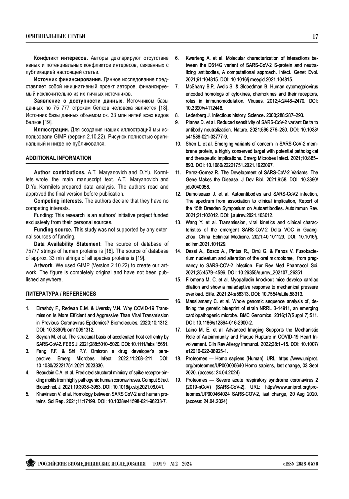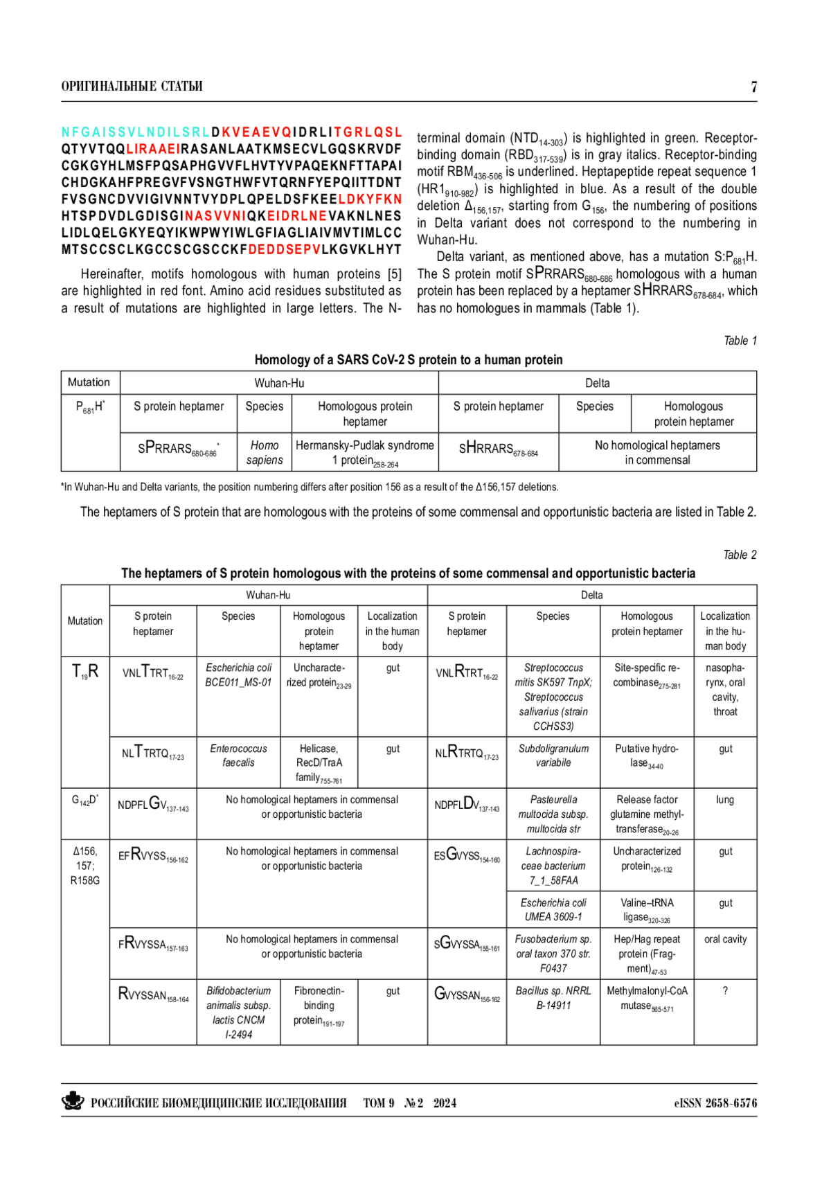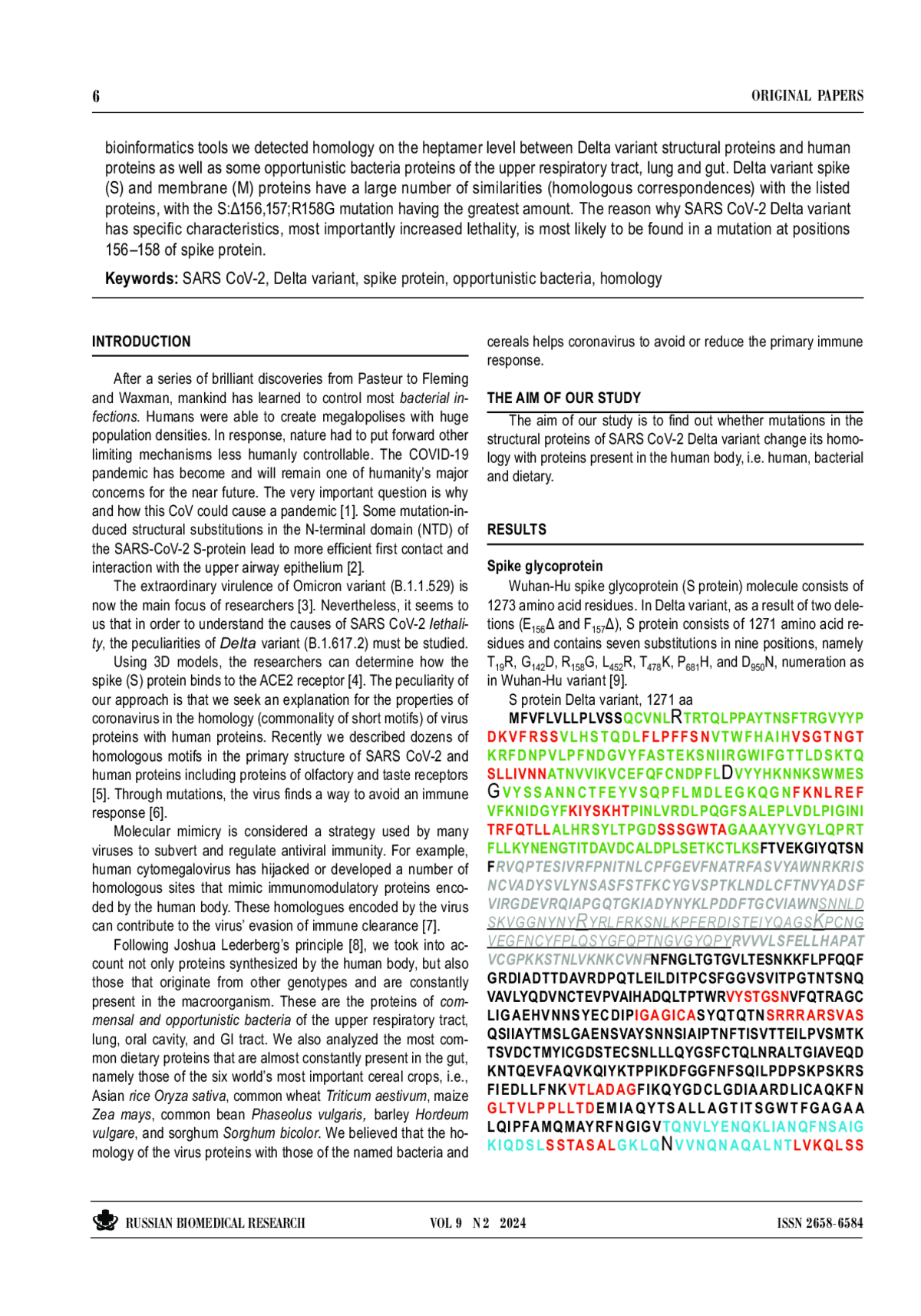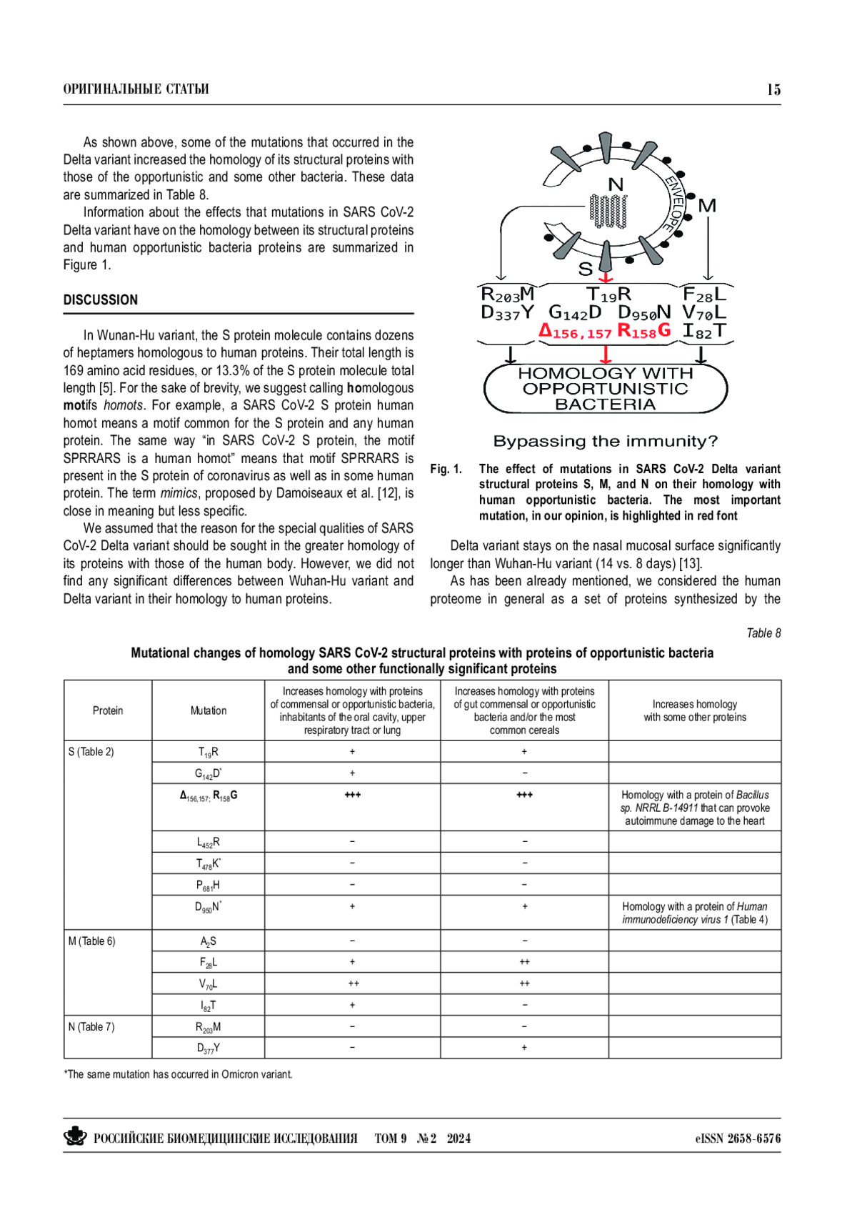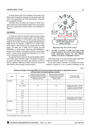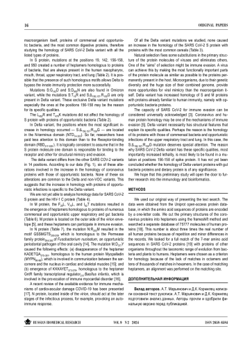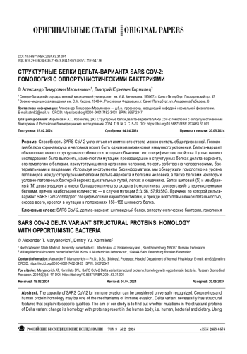 Способность SARS CoV-2 уклоняться от иммунного ответа можно считать общепризнанной. Гомология белков коронавируса и человека может быть одним из механизмов иммунного уклонения. Дельта-вариант обязательно имеет структурные особенности, которые объясняют его специфические свойства. Целью нашего исследования было выяснить, изменяют ли мутации, произошедшие в структурных белках дельта-варианта, его гомологию с белками, присутствующими в организме человека, то есть собственно человеческими, бактериальными и пищевыми. Используя инструменты биоинформатики, мы обнаружили гомологию на уровне гептамеров между структурными белками дельта-варианта и белками человека, а также белками некоторых условно-патогенных бактерий верхних дыхательных путей, легких и кишечника. Белки шиповый (S) и мембранный (M) дельта-варианта имеют большое количество сходств (гомологичных соответствий) с перечисленными белками, причем наибольшее количество — в случае мутации S:Δ156,157; R158G. Причина, по которой дельтавариант SARS CoV-2 обладает специфическими характеристиками, и прежде всего повышенной летальностью, скорее всего, кроется в мутации в положениях 156–158 шипового белка.