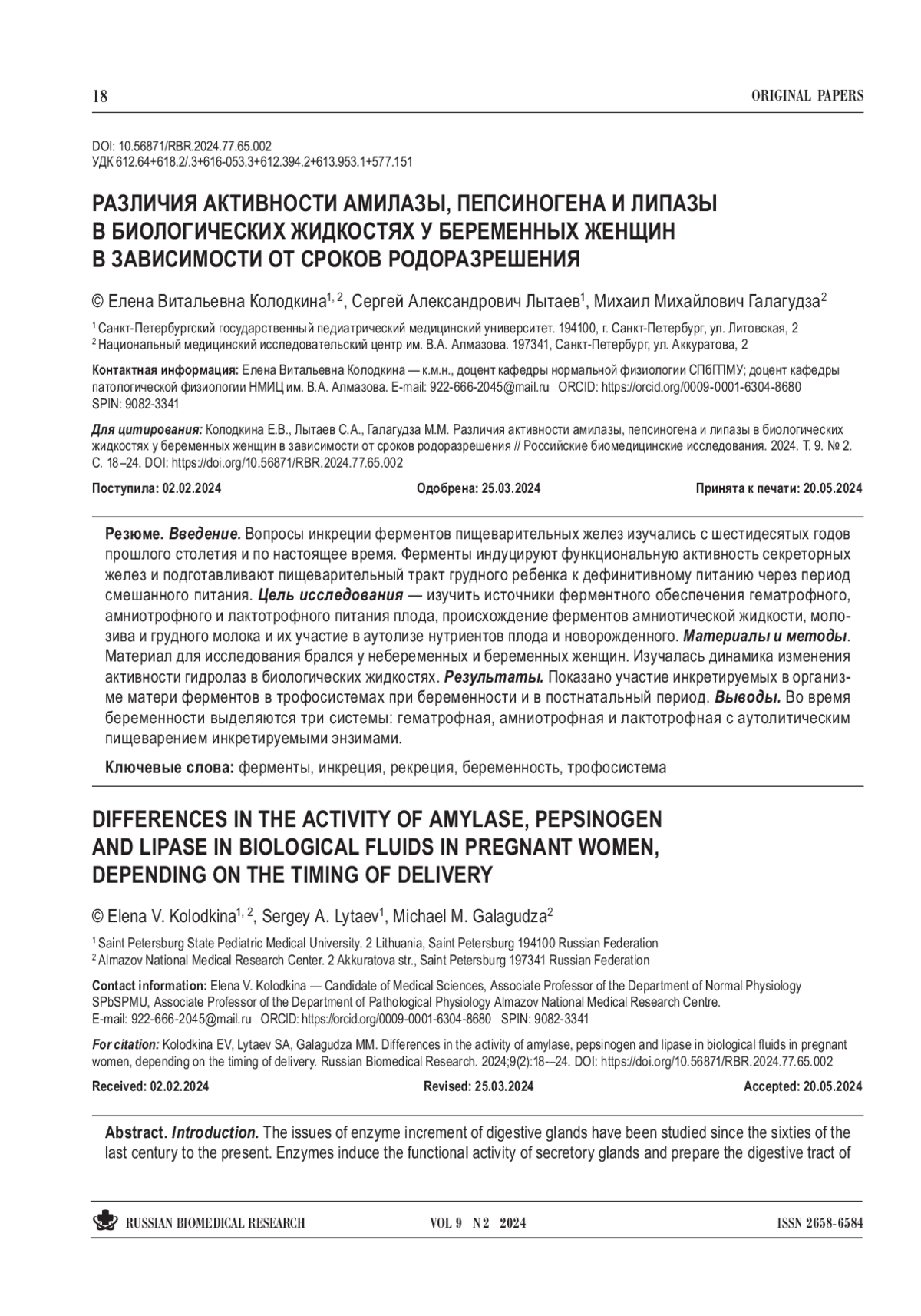 Вопросы инкреции ферментов пищеварительных желез изучались в лаборатории профессора Г. Ф. Коротько с шестидесятых годов прошлого столетия и по настоящее время [6–8]. Решалась проблема о биологической значимости гомеостазирования гидролаз (зимогенов и ферментов) в крови. Была раскрыта их многообразная роль в организме, включая анаболическую, регуляторную, информационную, транспортную и другие функции пепсиногена, амилазы, липазы, щелочной фосфатазы [6, 11, 15].
